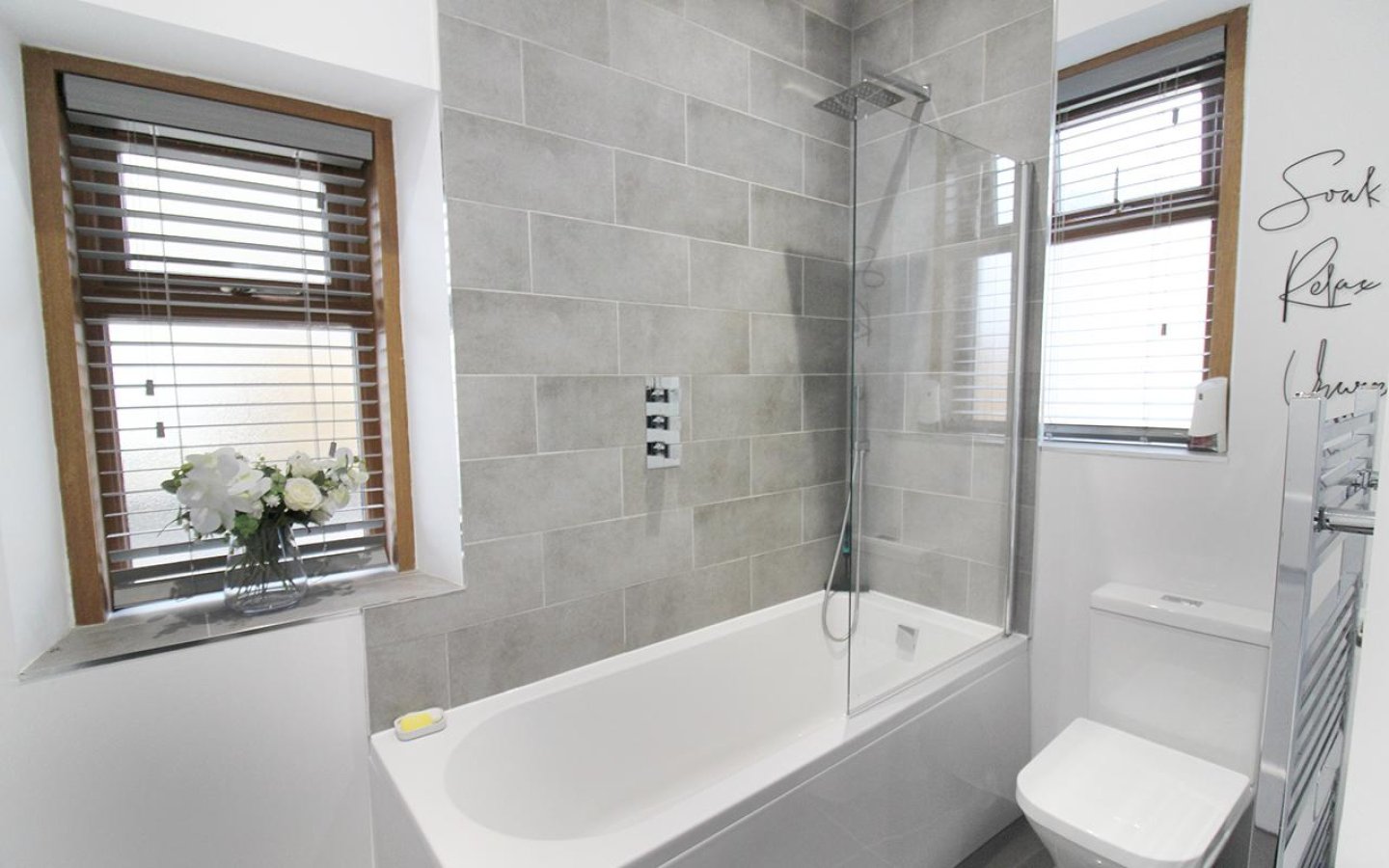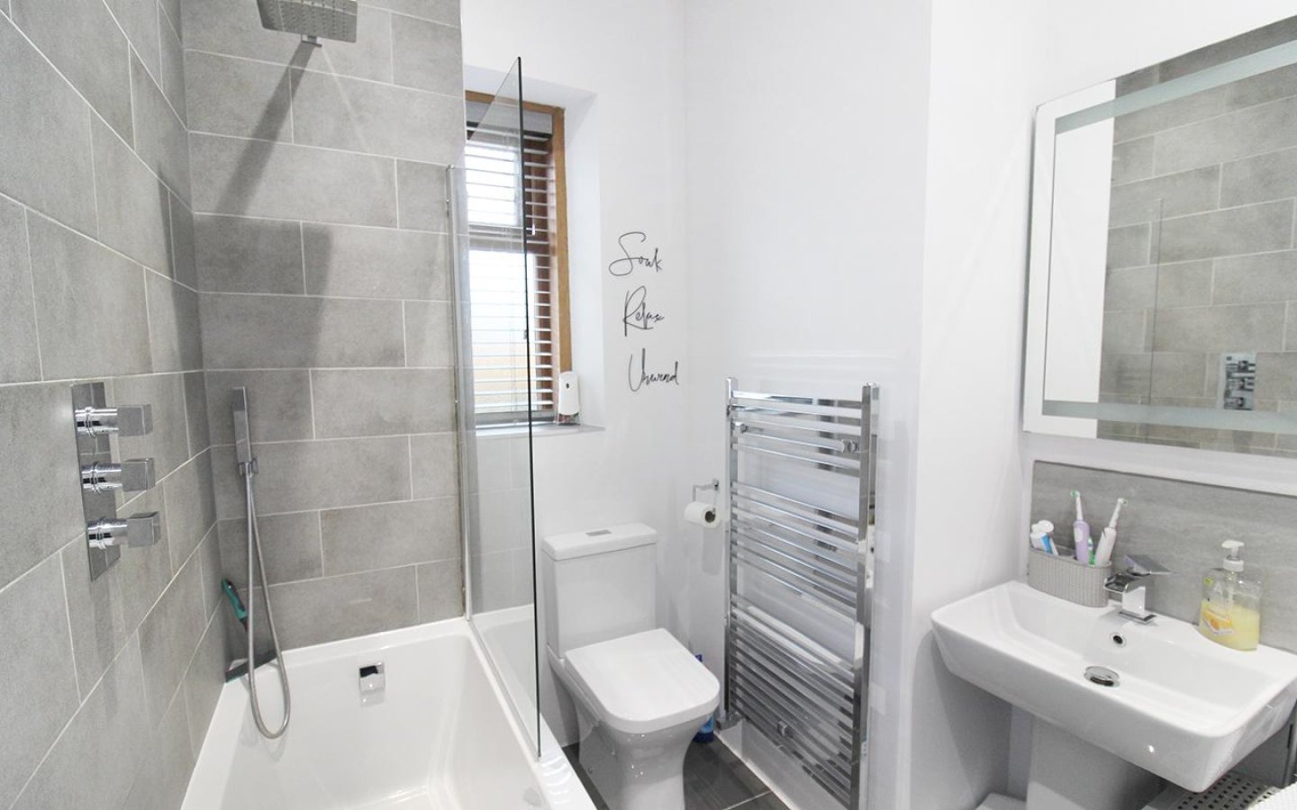 The modern bathroom room has frosted windows to the side and rear and is fitted with a white suite comprising a WC, hand basin, and bath. A mains rainfall shower with secondary adjustable handset is installed over the bath and finished with aqua panelling. The bathroom also features a chrome towel rail, wall-mounted mirror, and other accessories, along with a shelved cupboard for storage.