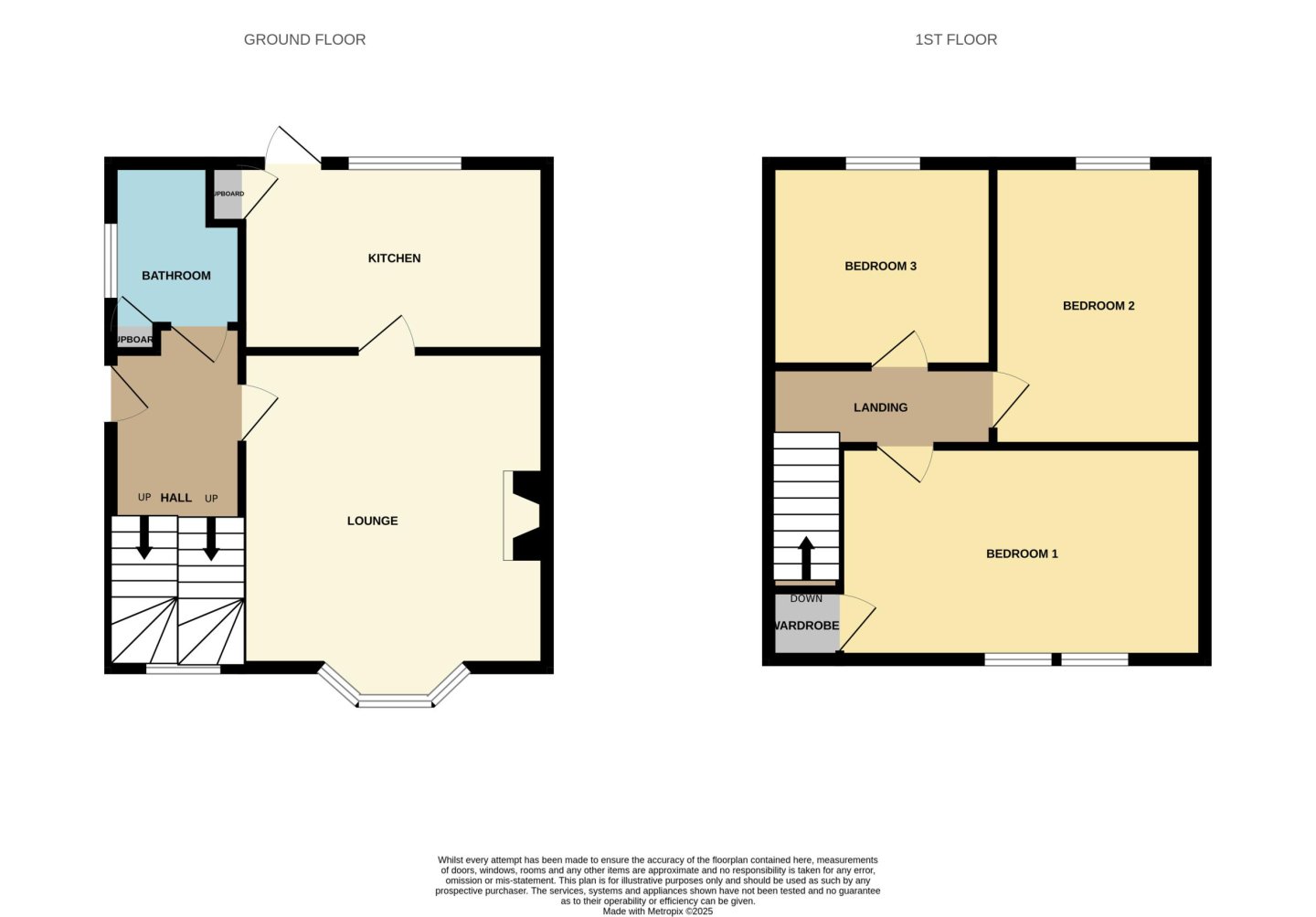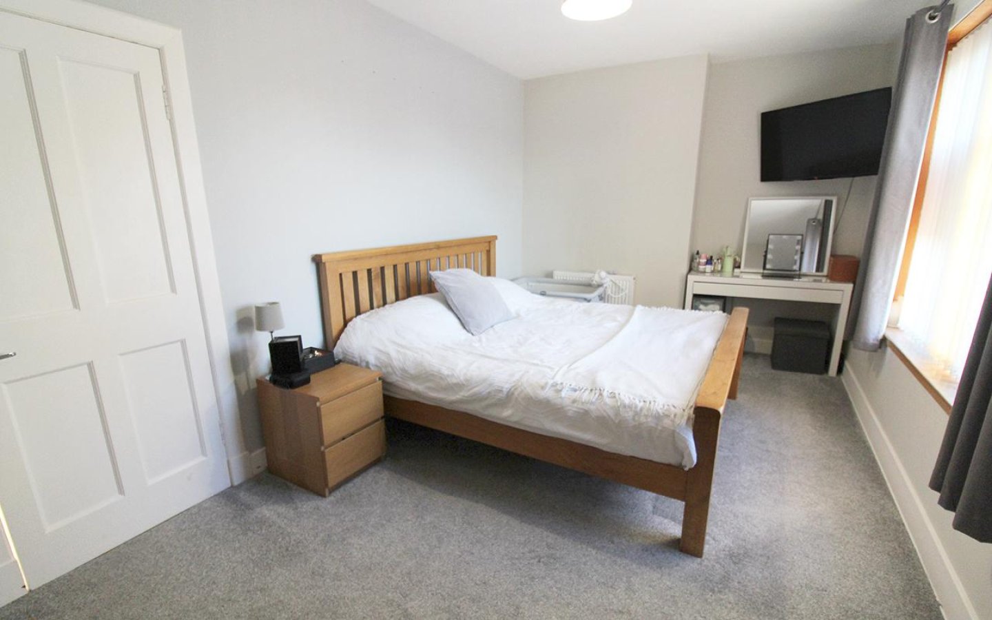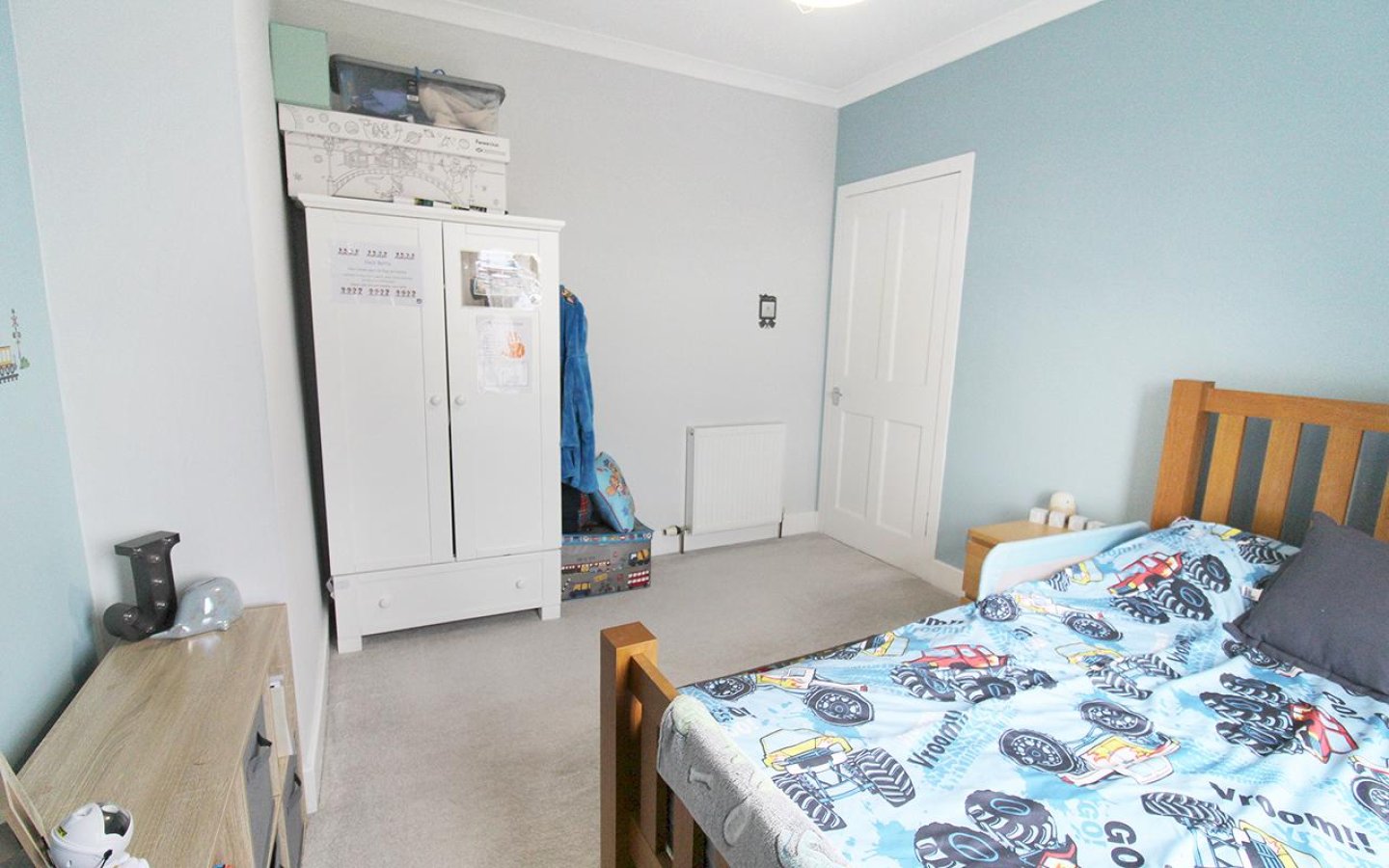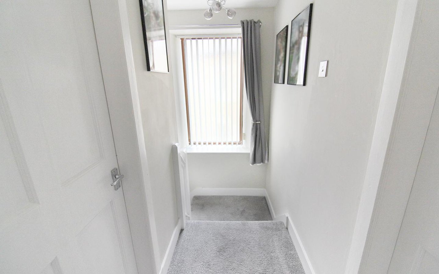 A carpeted staircase leads to the first-floor landing, which accesses the three double bedrooms. A window on the staircase provides natural light to the landing. Bedroom 1 has a front-facing window and a built-in cupboard with both hanging rail and shelving. Bedrooms 2 and 3 overlook the rear garden, and all three bedrooms are fitted with carpets.