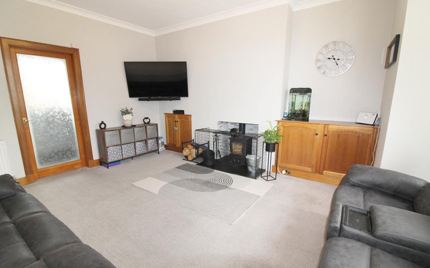 The property is well presented, with a modern bathroom, and is in walk-in condition. Access is via a glazed composite door leading into the hall, which provides access to the lounge, bathroom, and staircase to the first floor. The lounge is a bright and welcoming room with a bay window to the front. Decorated in neutral tones with fitted carpet, it features a wood-burning stove as the focal point, set between two built-in cupboards and sitting on a slate hearth. A glazed door leads through to the dining kitchen.