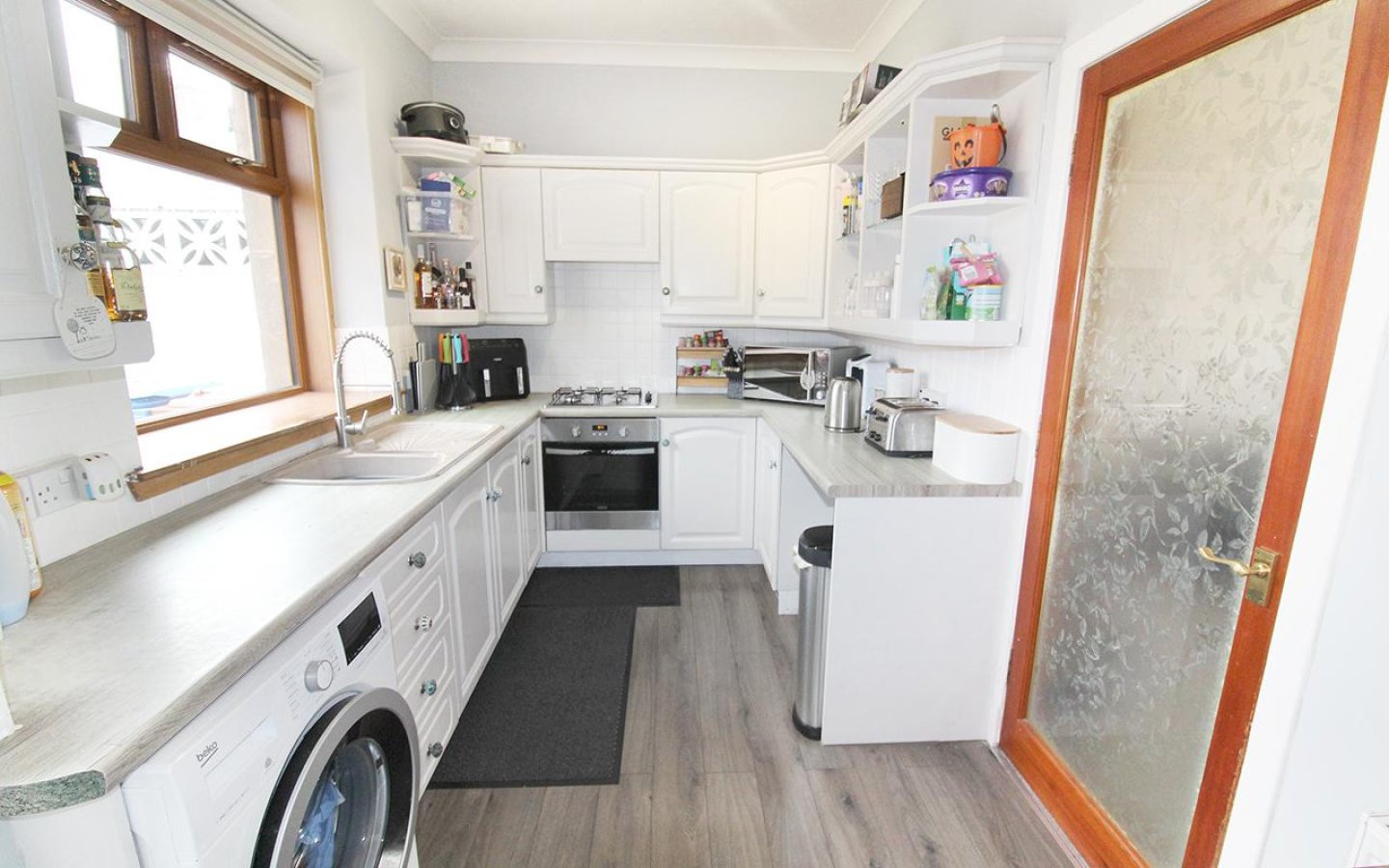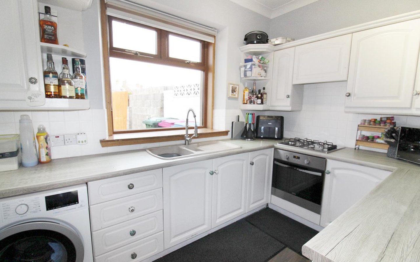 The kitchen is fitted with a selection of base and wall-mounted units, contrasting worktop, and tiled splashback. Integrated appliances include an electric oven and gas hob with extractor above. A 1 ½ resin sink with drainer and pull-out mixer tap is positioned beneath the window overlooking the rear garden. There is plumbing for a washing machine and space for a dining set. A glazed composite door opens directly to the rear garden.