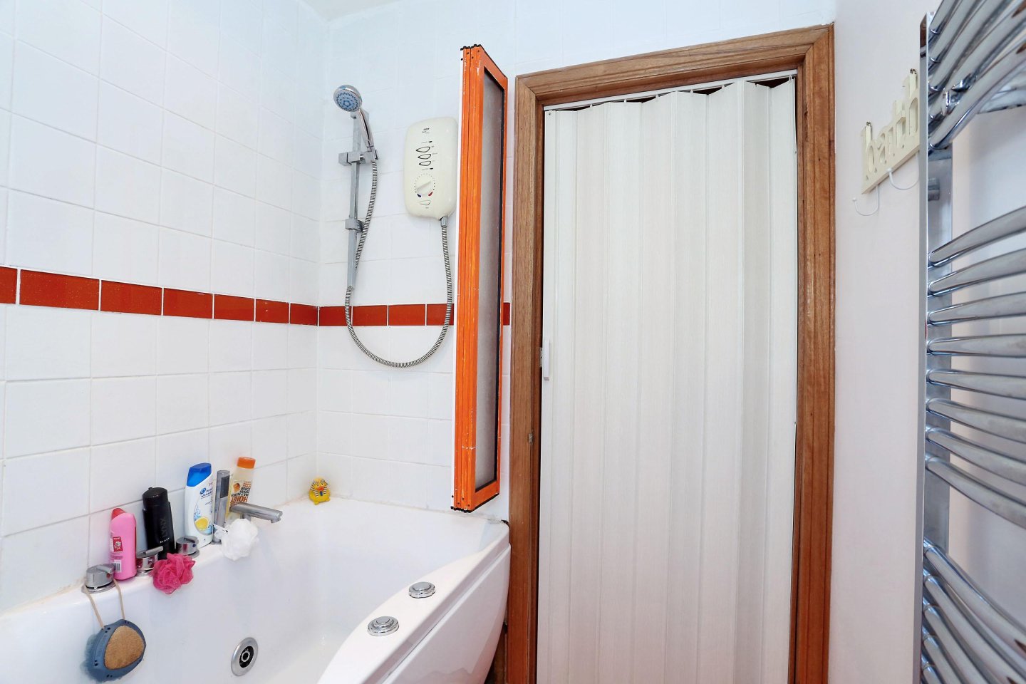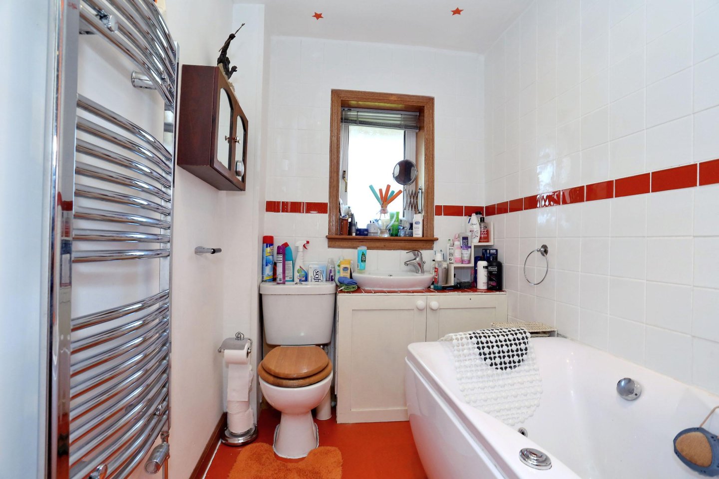 BATHROOM: (7’7” x 5’6” approx) Fitted with a white three piece suite comprising, WC, wash hand basin set within a vanity unit and Jacuzzi bath with overhead shower. Opaque window overlooking the front. Chrome ladder style radiator. Vinyl flooring.