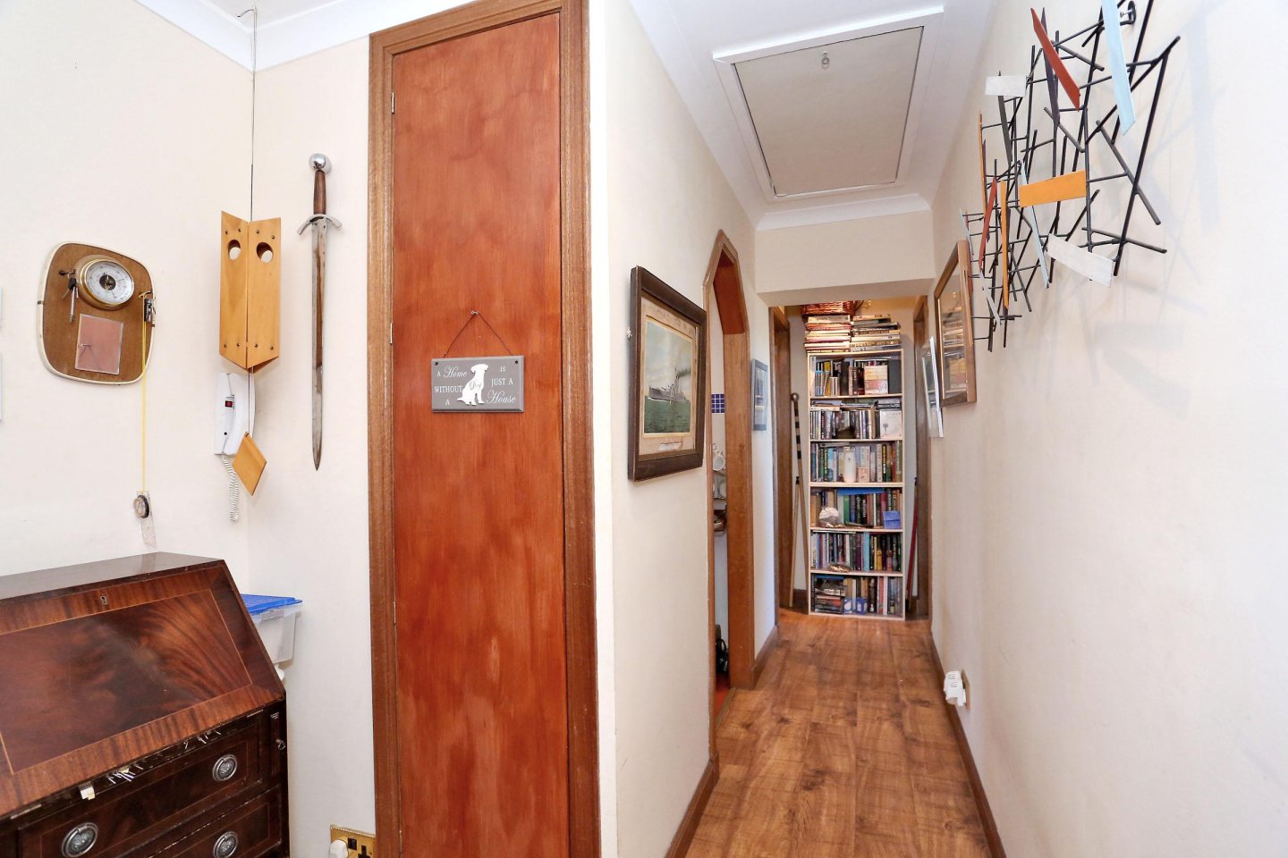 HALL: Provides access to all accommodation. Two storage cupboards with shelving provide welcome storage. Hatch with ramsay ladder to fully floored loft. Laminate flooring.