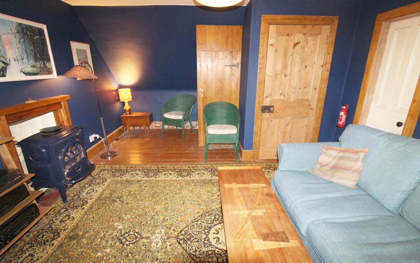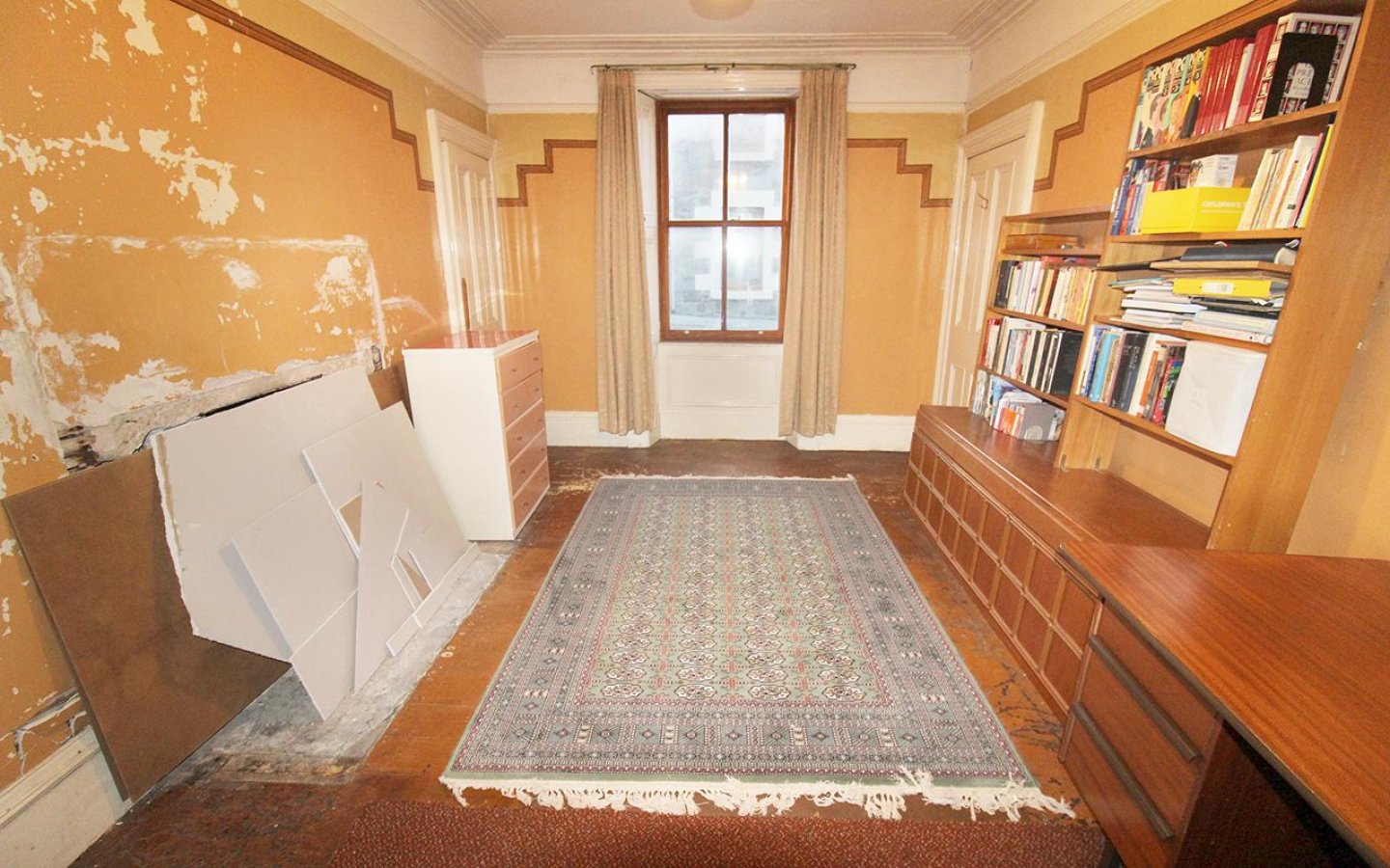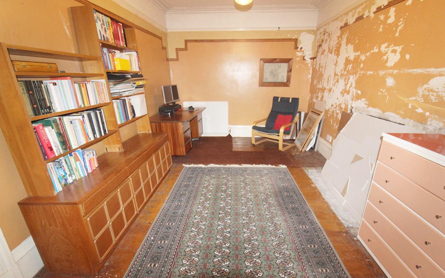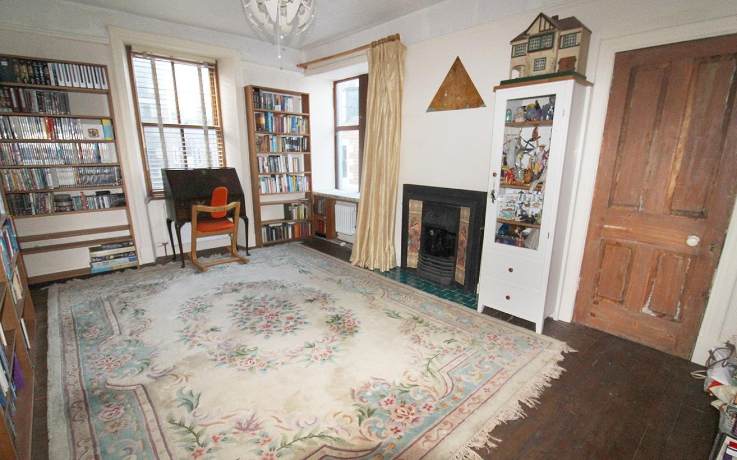 The ground-floor bedroom/sitting room retains many traditional features, including deep skirtings, decorative coving, picture rail, ceiling rose with thistle motif, and window panelling at the front-facing window. This room also has exposed floorboards.