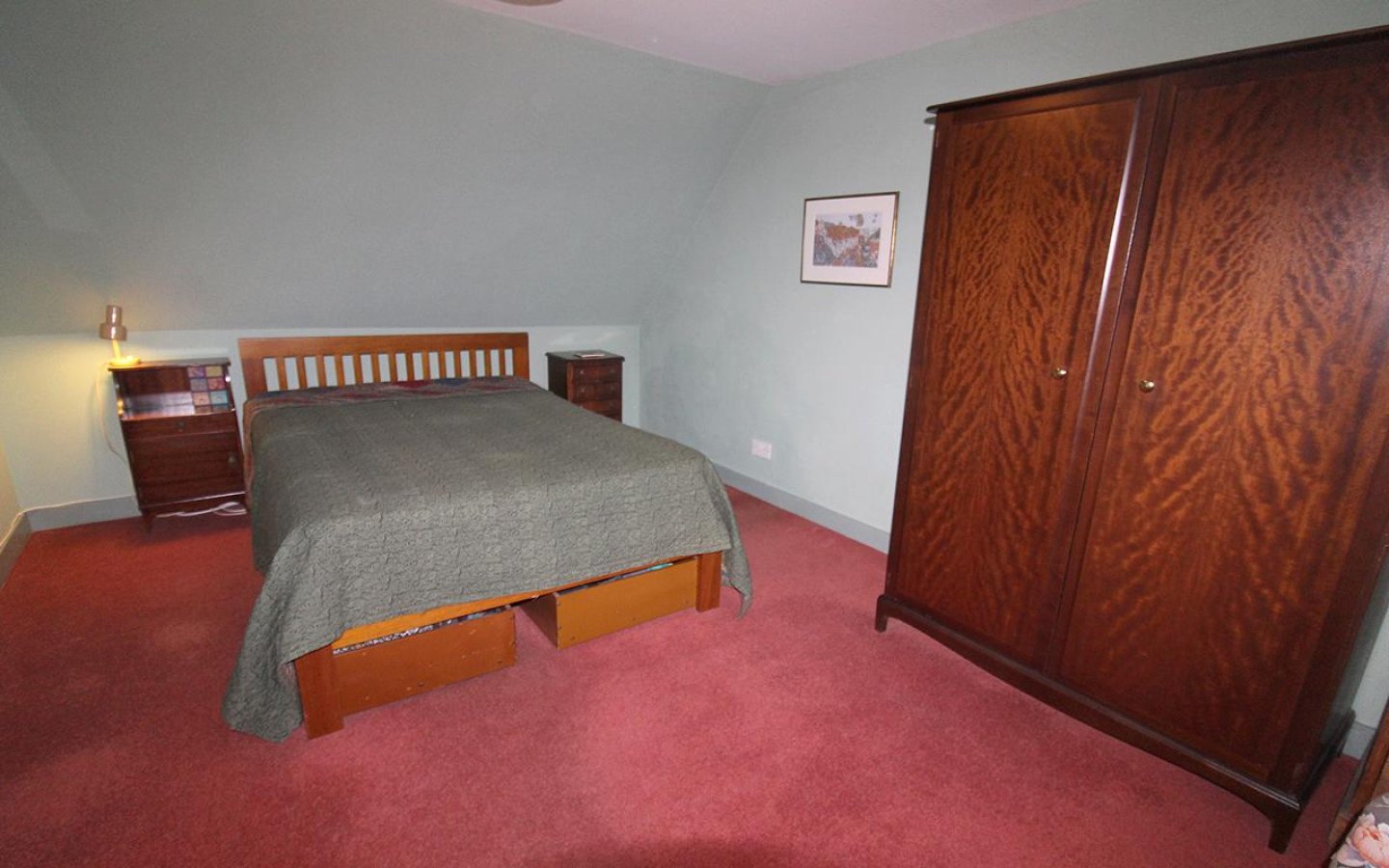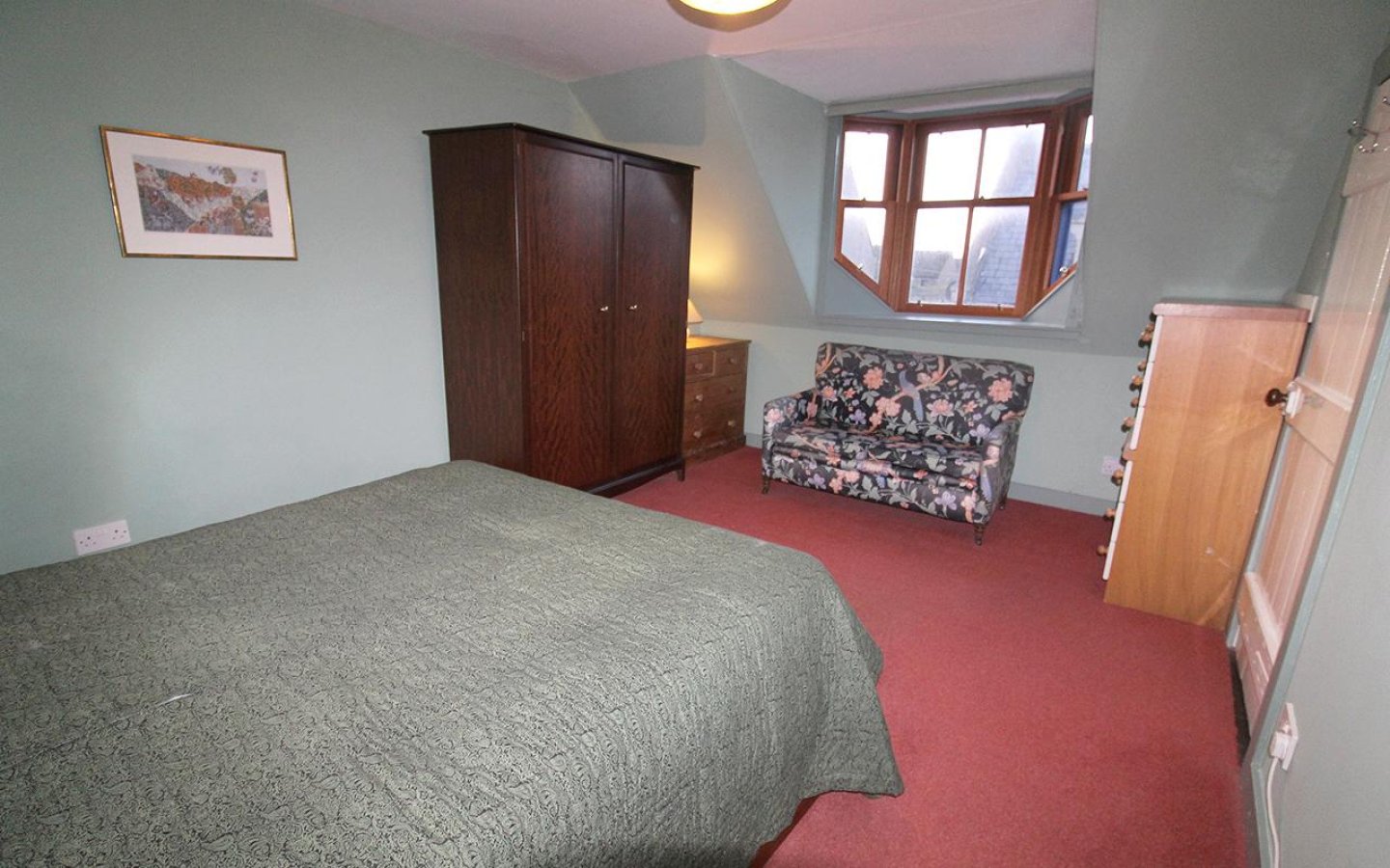 Bedroom 1 is a large double with a bay window and deep display sill to the front of the property, painted in a heritage green with a complementary fitted carpet. Bedroom 2 is also a large double and is currently utilised as an additional sitting room. It has exposed floorboards, a wooden fire surround, a built-in wardrobe, and a door to the rear porch. The porch offers further storage and has a glazed door to the external staircase.