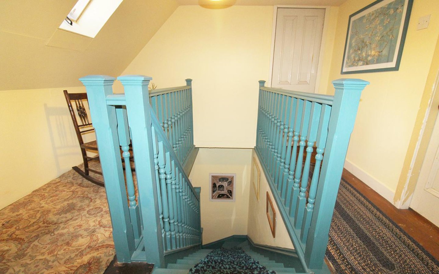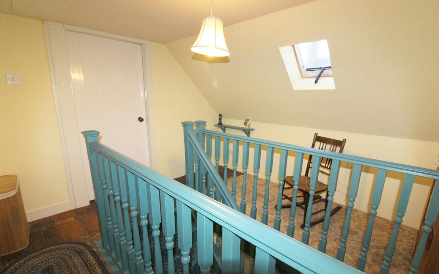 The first floor is accessed by a traditional wooden staircase with painted treads, newel posts, and spindles, with a carpet runner leading to the landing. The landing has a roof window to the front of the property and accesses both bedrooms and the bathroom.