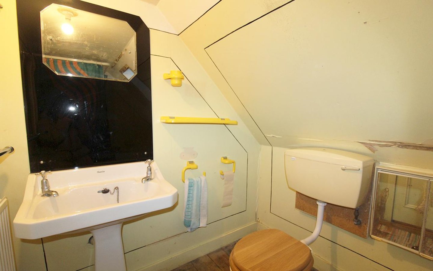 The bathroom consists of a WC, handbasin, and bath with electric shower over. A roof window overlooks the rear garden.