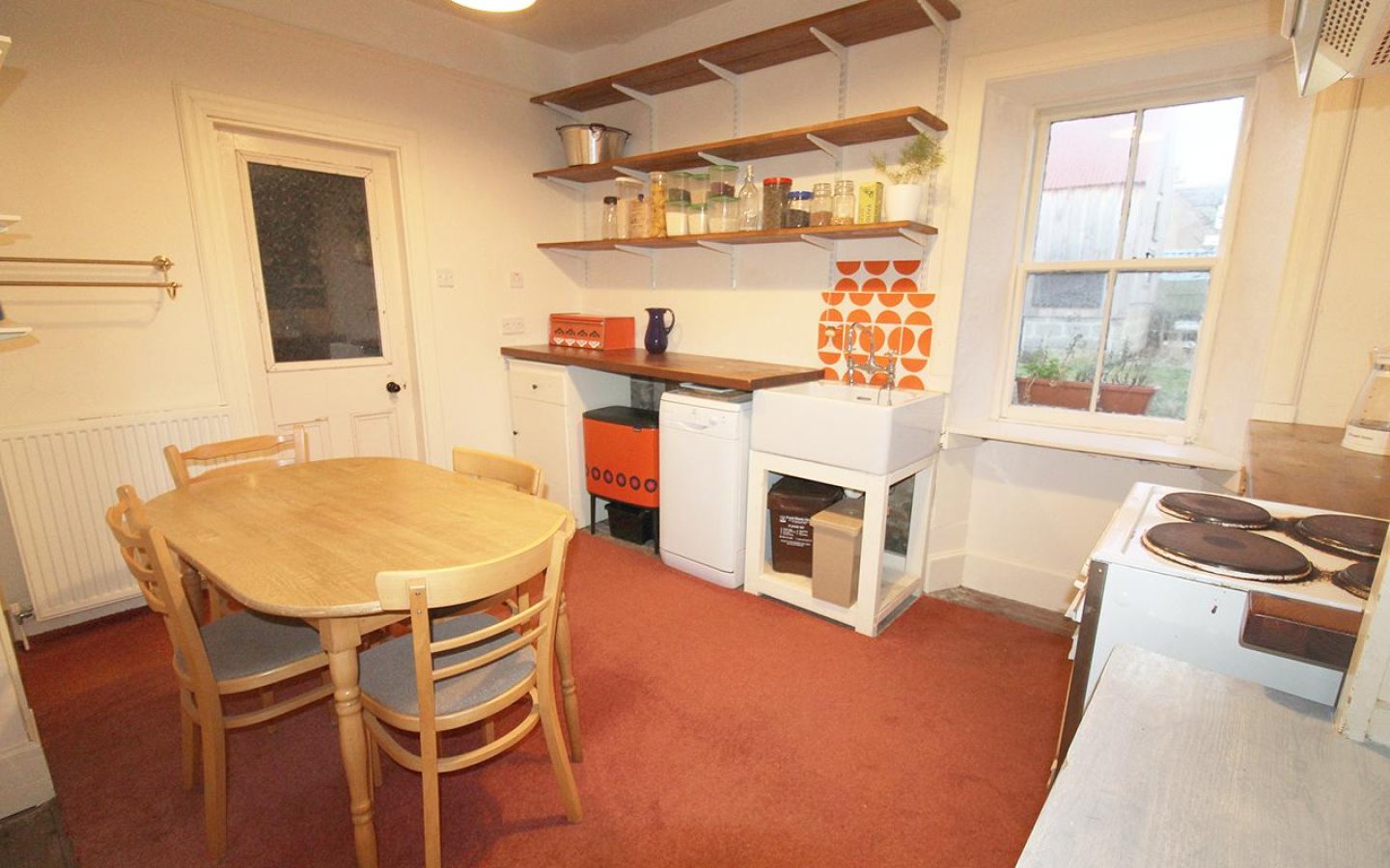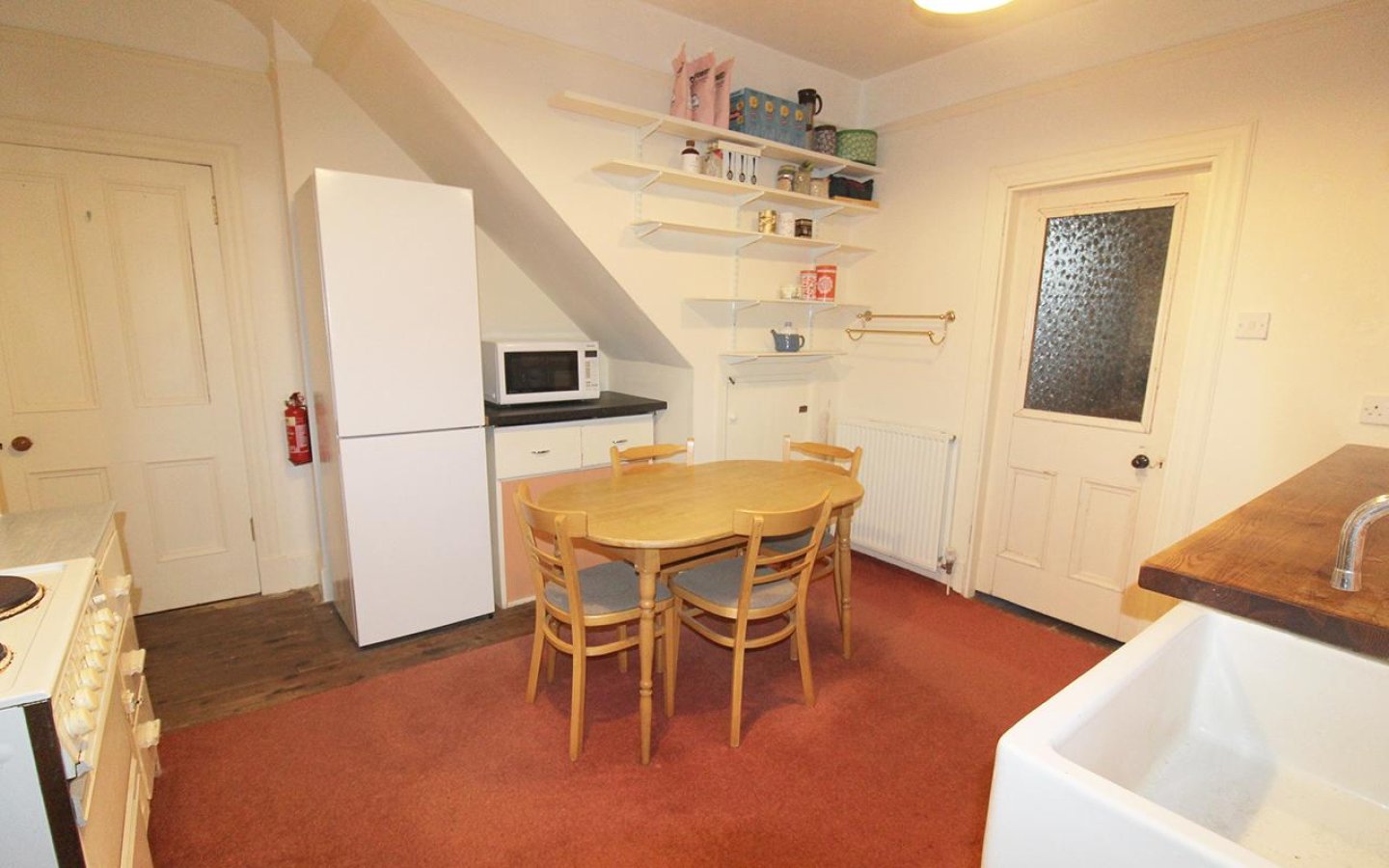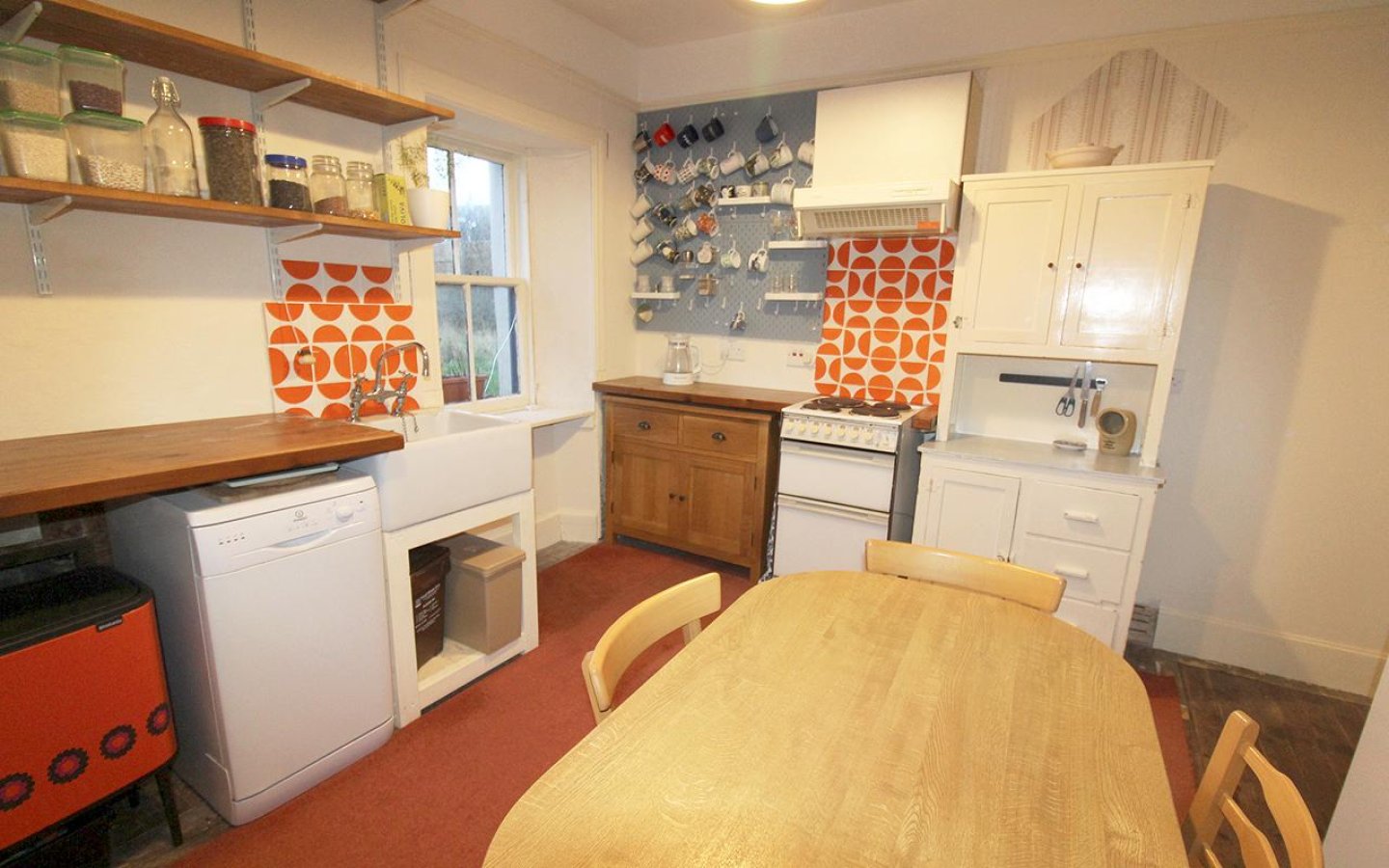 The kitchen is accessed from the hall as well as the living room and has a window overlooking the rear garden. It features a mix of wooden and laminate worktops with freestanding cupboards below, as well as fixed shelving. A large ceramic sink sits within its own unit, and there is a slot-in electric oven with extractor above. There is ample space for a dining set.
