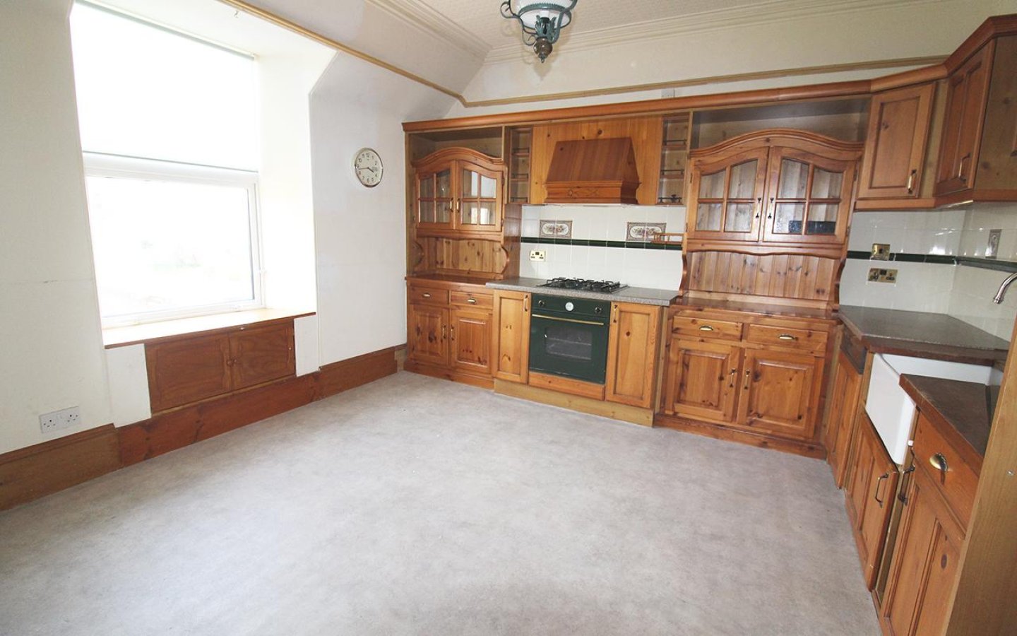 The kitchen is fitted with a traditional style wooden kitchen with integrated appliances comprising a gas oven, hob and dishwasher as well as a deep ceramic sink. A large understairs cupboard provides additional storage. A door from the kitchen opens to the staircase to the second floor.