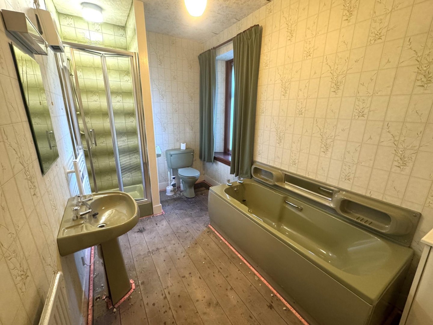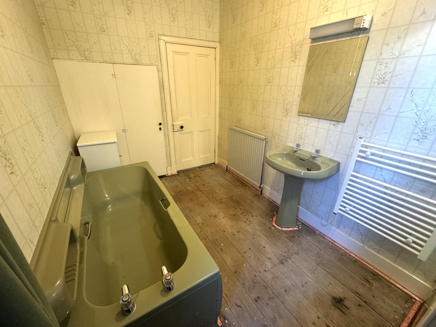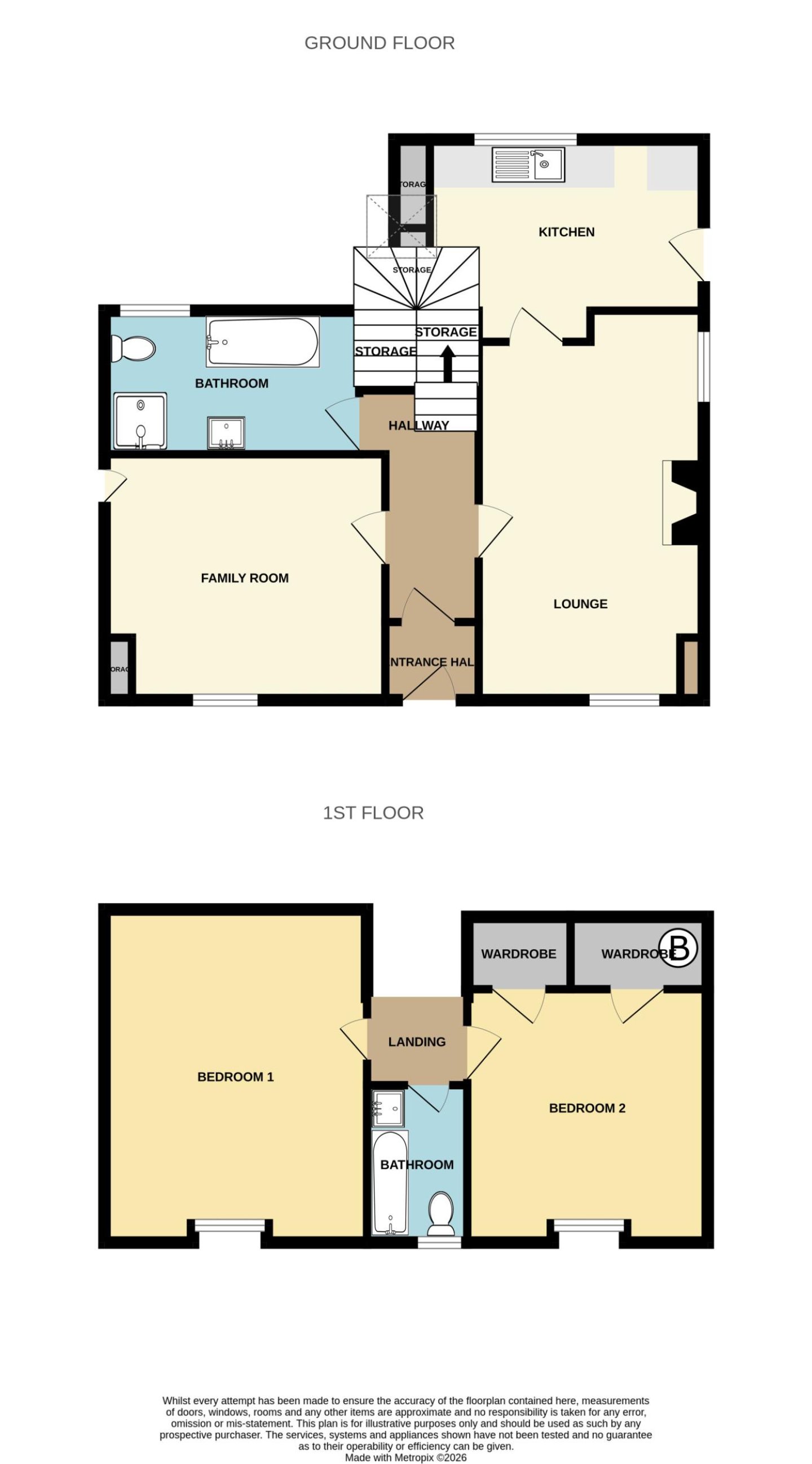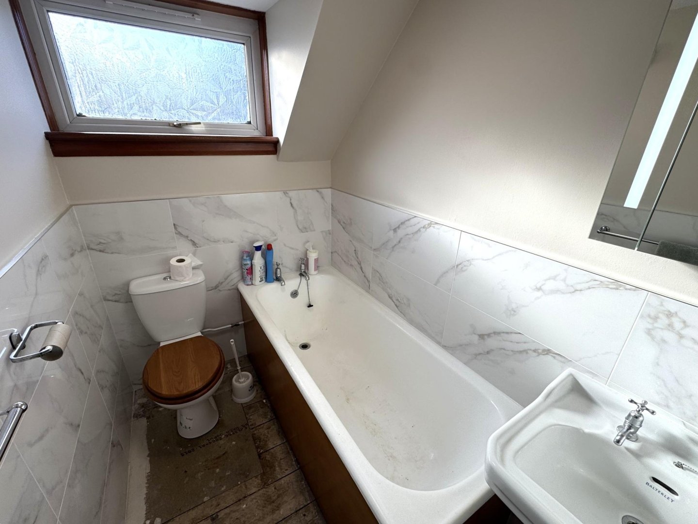 The bathroom has a 4 piece suite consisting of W/C, rectangular sink with two taps, with mirror above, enclosed shower unit and bath. An understairs storage cupboard provides additional storage. A rear facing opaque window provides natural light.