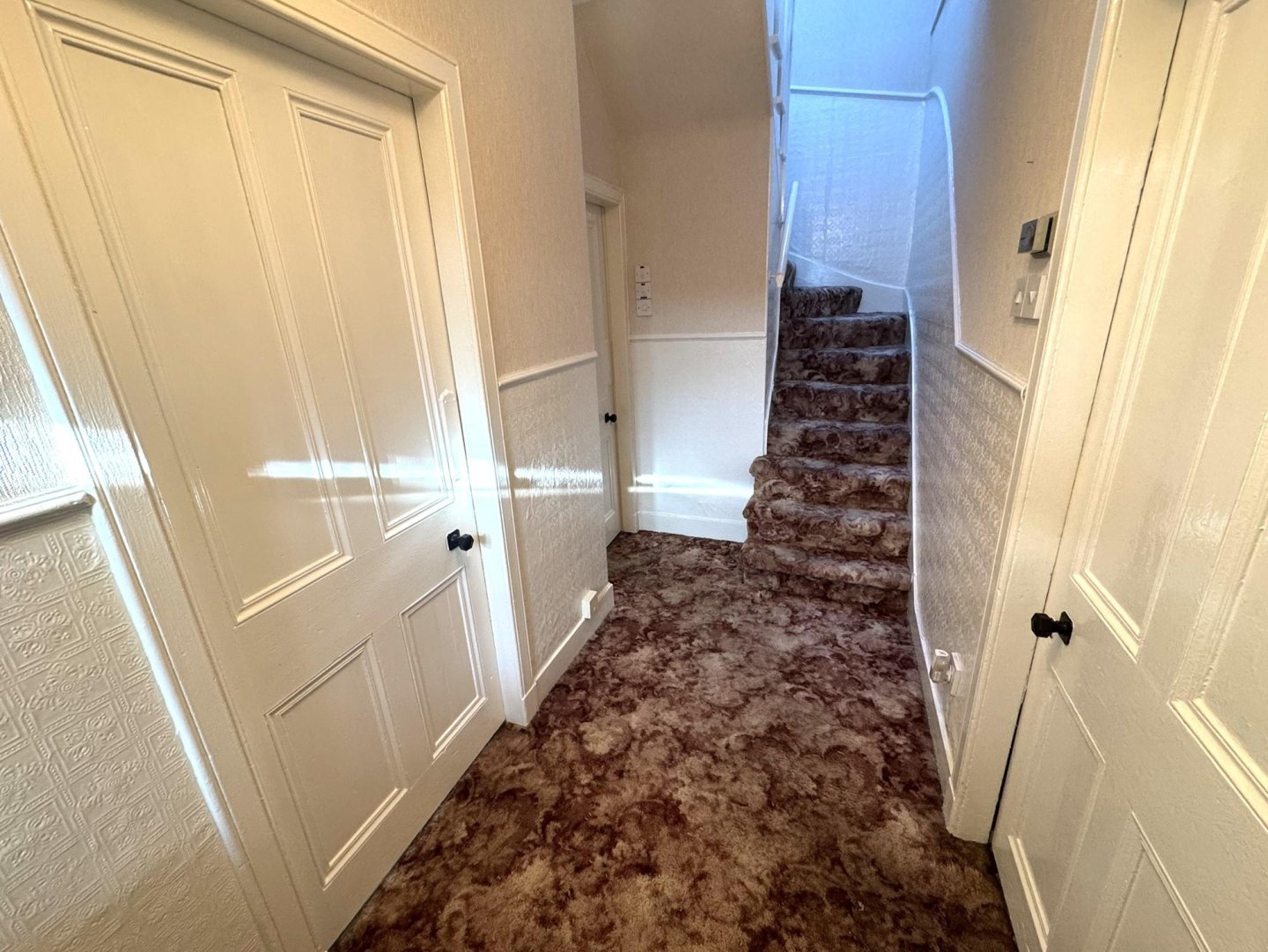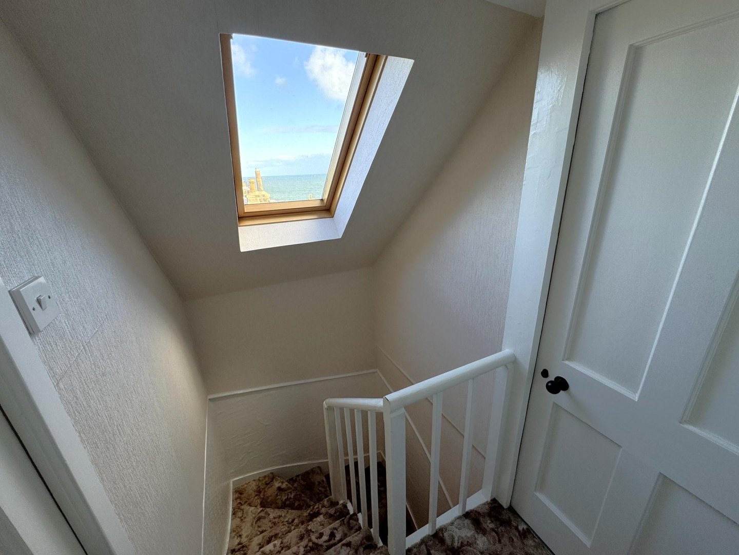 The staircase leads on to a carpeted landing, skylight provides natural light and boasts sea views from the first floor. Access can be gained to both bedrooms 1 & 2 and upstairs bathroom.