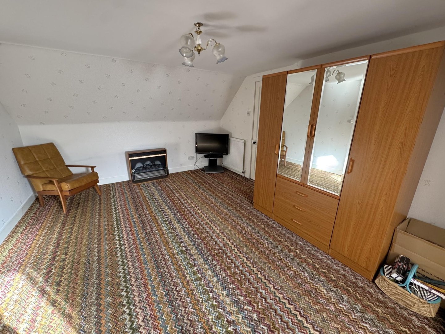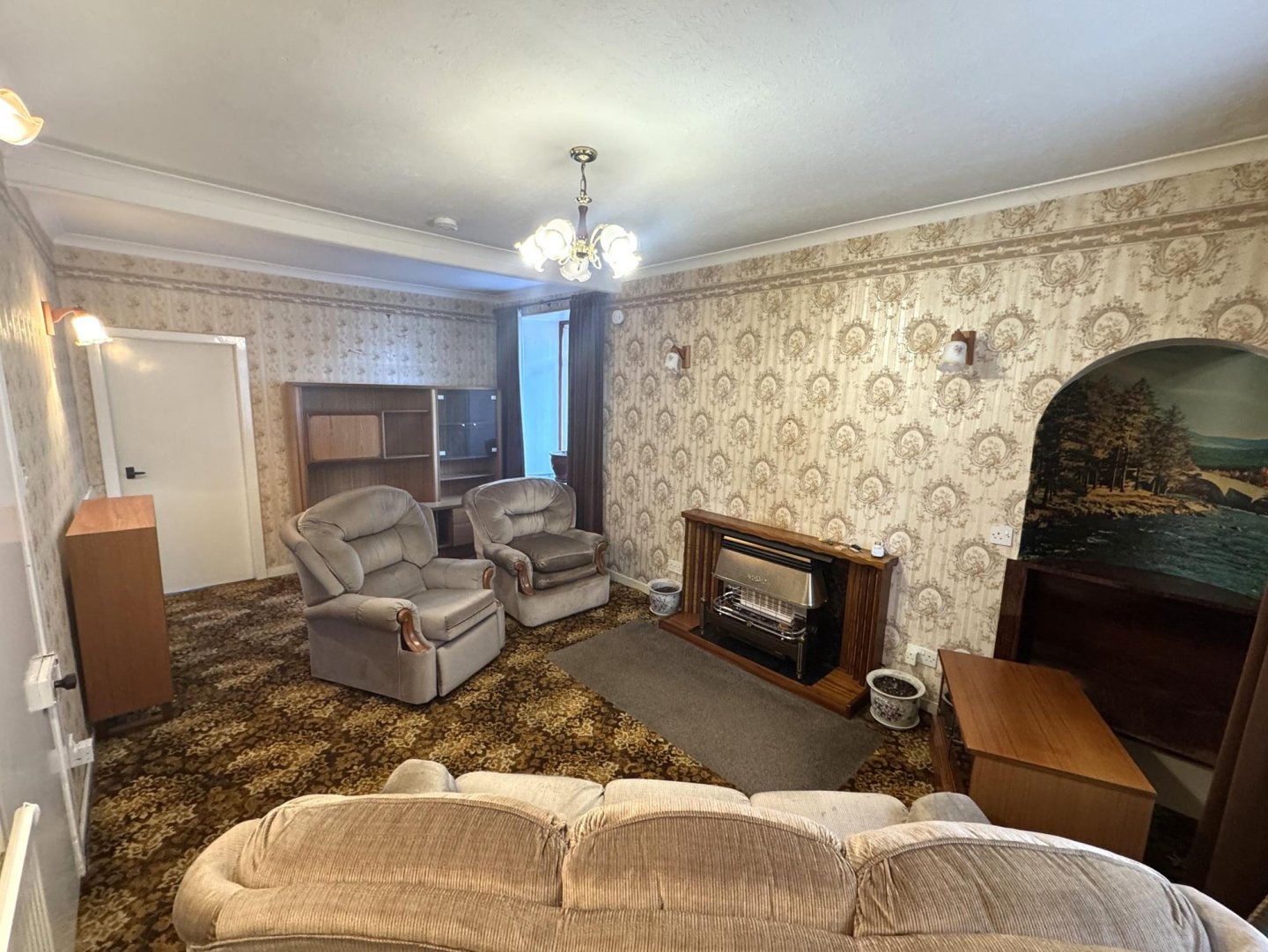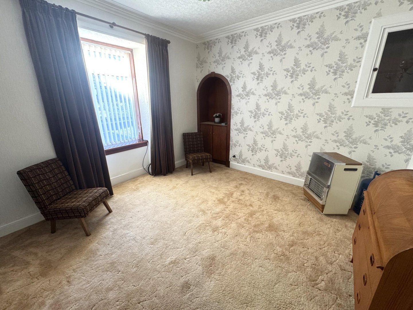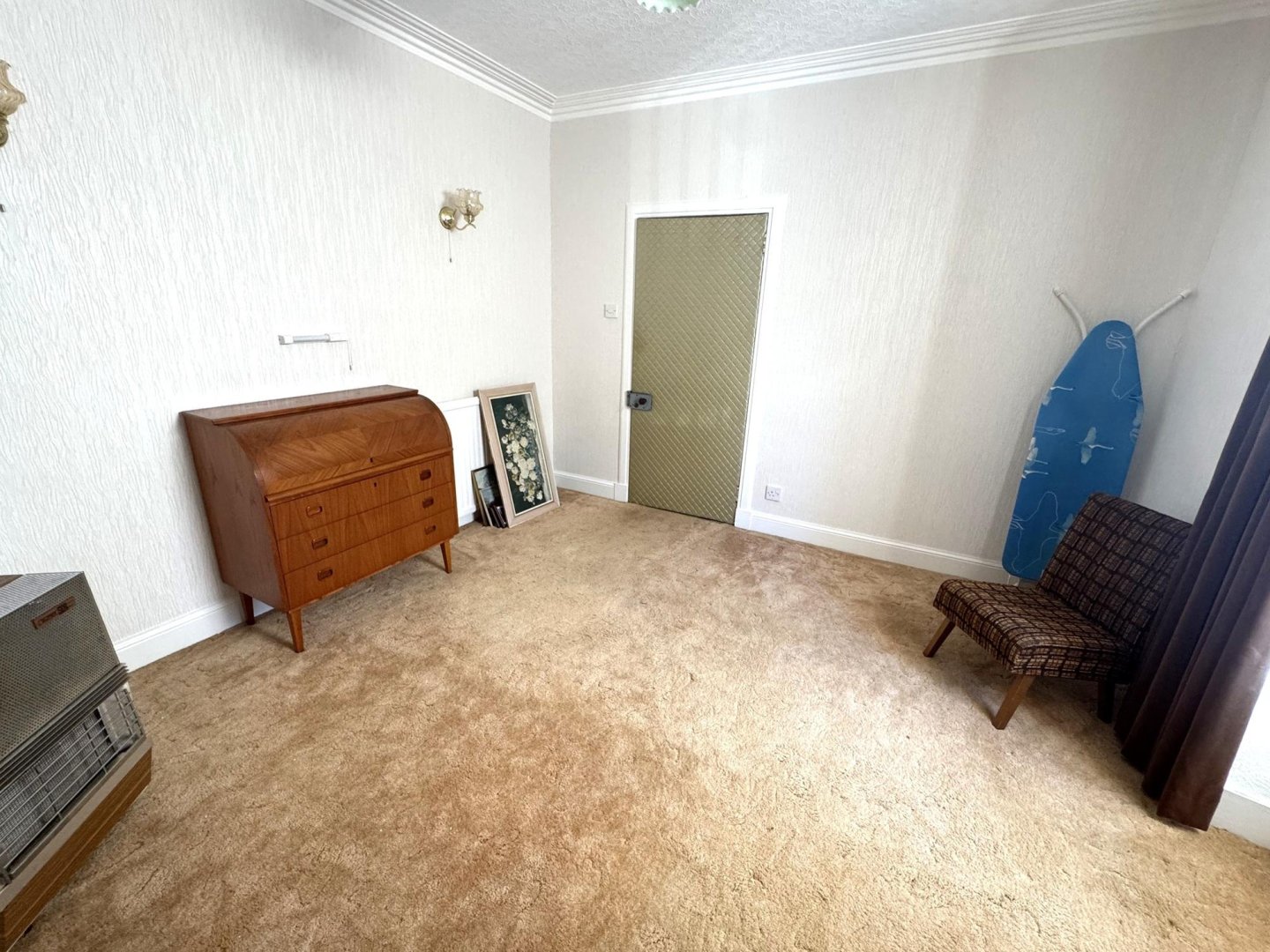 This multipurpose room is neutrally decorated with wallpaper, carpet and traditional style coving. Small storage/display cupboard built into the wall with a glass panel door . Alcove with shelf and built in cupboard houses the electrics. Front facing window overlooks St Catherine Street.