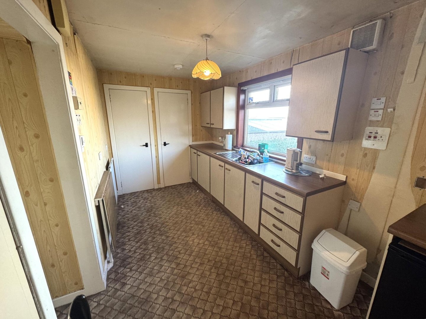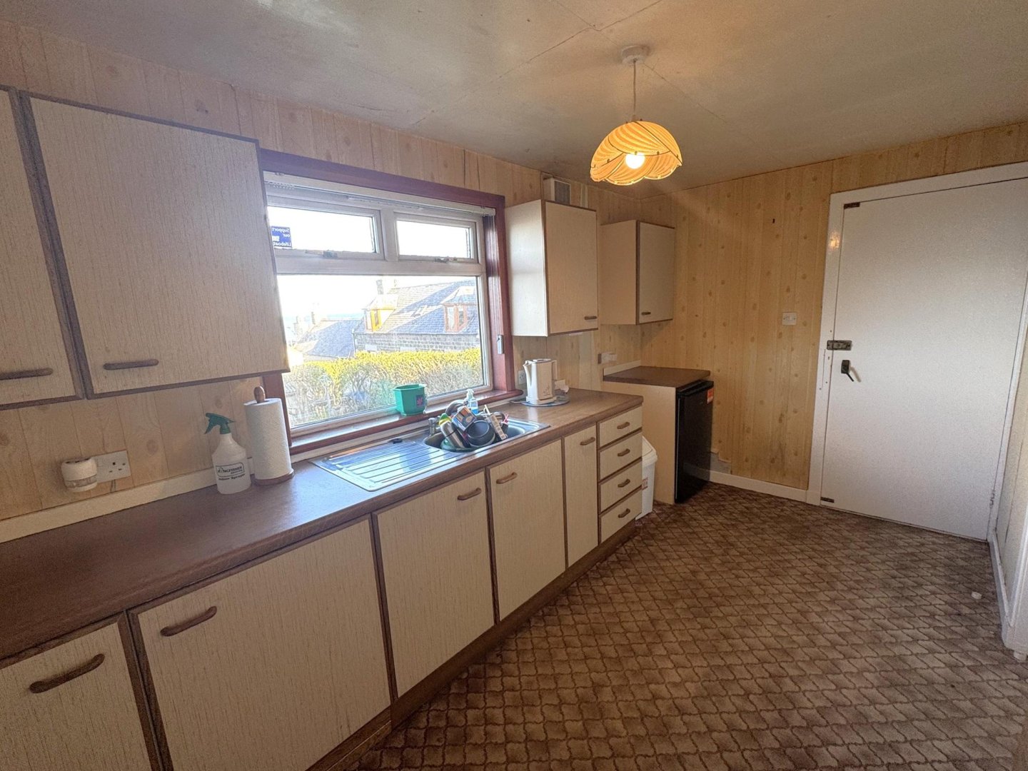 The lounge is decorated with wallpaper and carpet. A side window looks out on to Wood Street and the rear window looks out onto the garden. There is a gas fireplace within a traditional style tiled fireplace making it the focal point of the room. Understairs storage and alcove with built in shelving provides additional storage. Access can be gained to the kitchen.