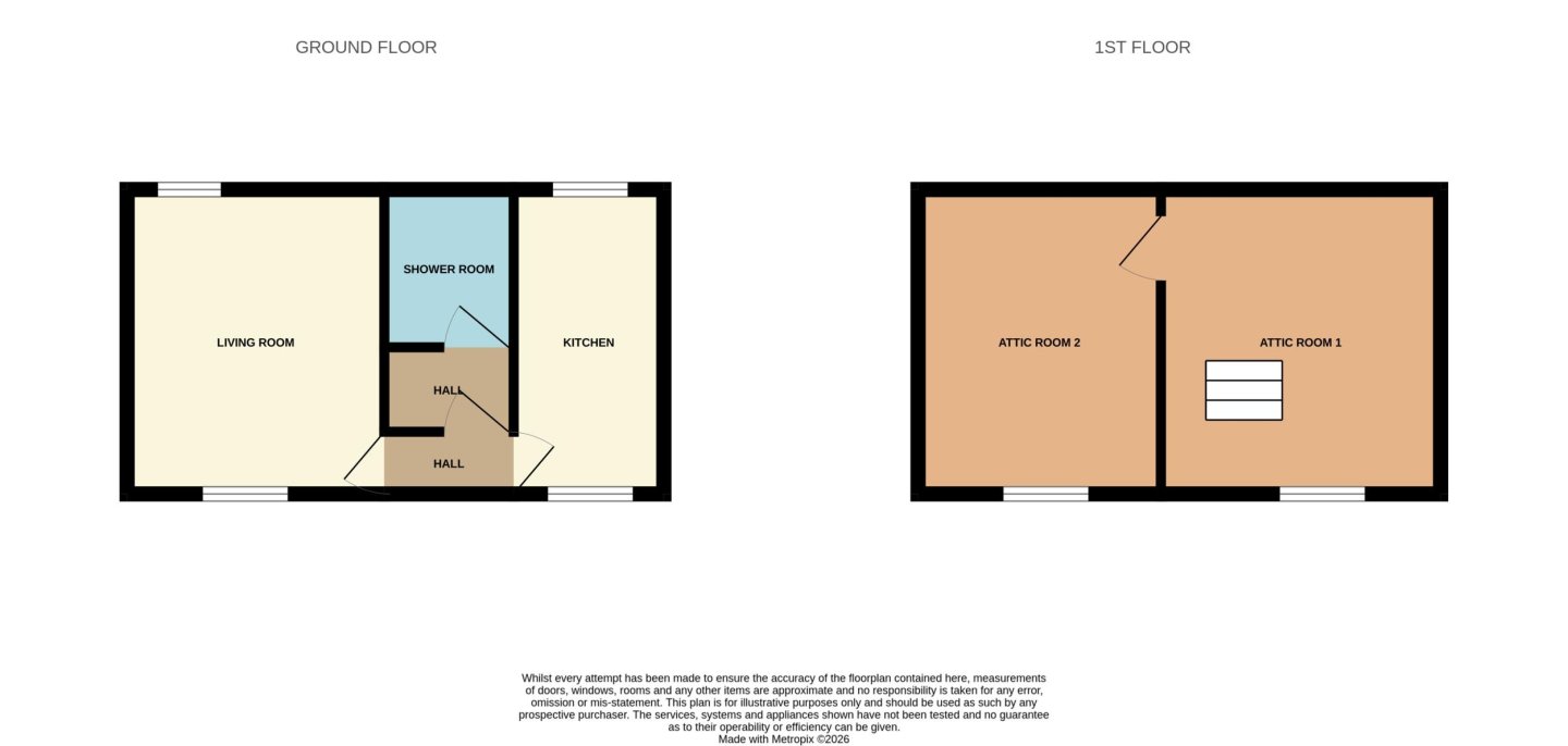 The accommodation currently comprises a hall, living room, kitchen, shower room and two attic rooms accessed via a Ramsay ladder. The property is entered via a timber glazed door into the hall, which provides access to the living room, kitchen, shower room and loft hatch. The living room is a dual-aspect room featuring a shelved alcove and deep display window sill. The kitchen is also dual aspect and is fitted with base units, worktop and stainless steel sink. The shower room is fitted with a white suite consisting WC, wash hand basin and shower cubicle with Mira Sport electric shower.