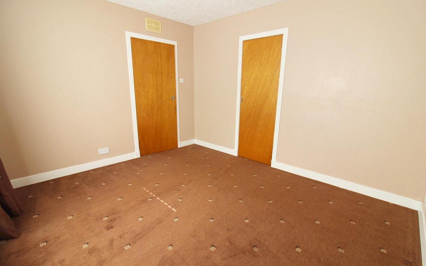 Both bedrooms are doubles and have built-in wardrobes with hanging rails and shelving. Bedroom 1 is front-facing and carpeted, while bedroom 2 is rear-facing with a wooden floor. The shower room is fitted with a white suite comprising WC, hand basin, and a shower cubicle with electric shower. A frosted rear window provides natural light, and the room is completed with wall-mounted accessories.