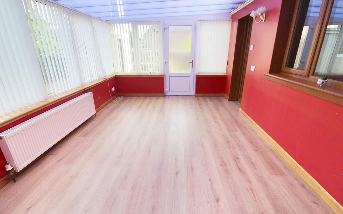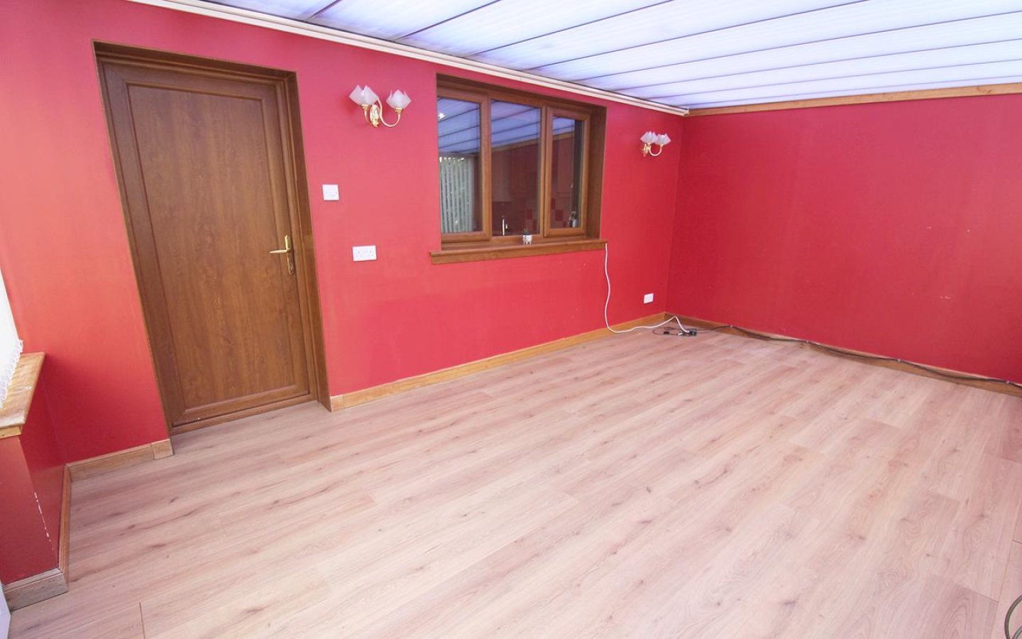 The lounge is a lovely bright room with a large front-facing window. A gas fire is set on a tiled fireplace, and the room is finished with a tartan carpet. The dining kitchen is fitted with a selection of base and wall-mounted units with contrasting worktop and tiled splashback. Appliances that will remain include an electric cooker, fridge, and dishwasher. A stainless steel sink with drainer and mixer tap is positioned beneath the rear-facing window, which overlooks the conservatory. The kitchen also benefits from two built-in shelved cupboards. From the kitchen, a rear vestibule with an additional storage cupboard leads into the conservatory, which provides a great space to enjoy views of the garden.