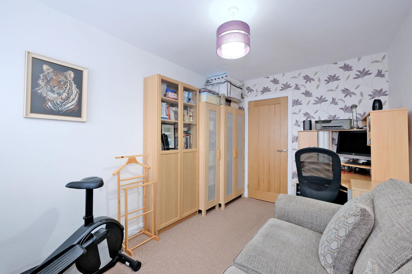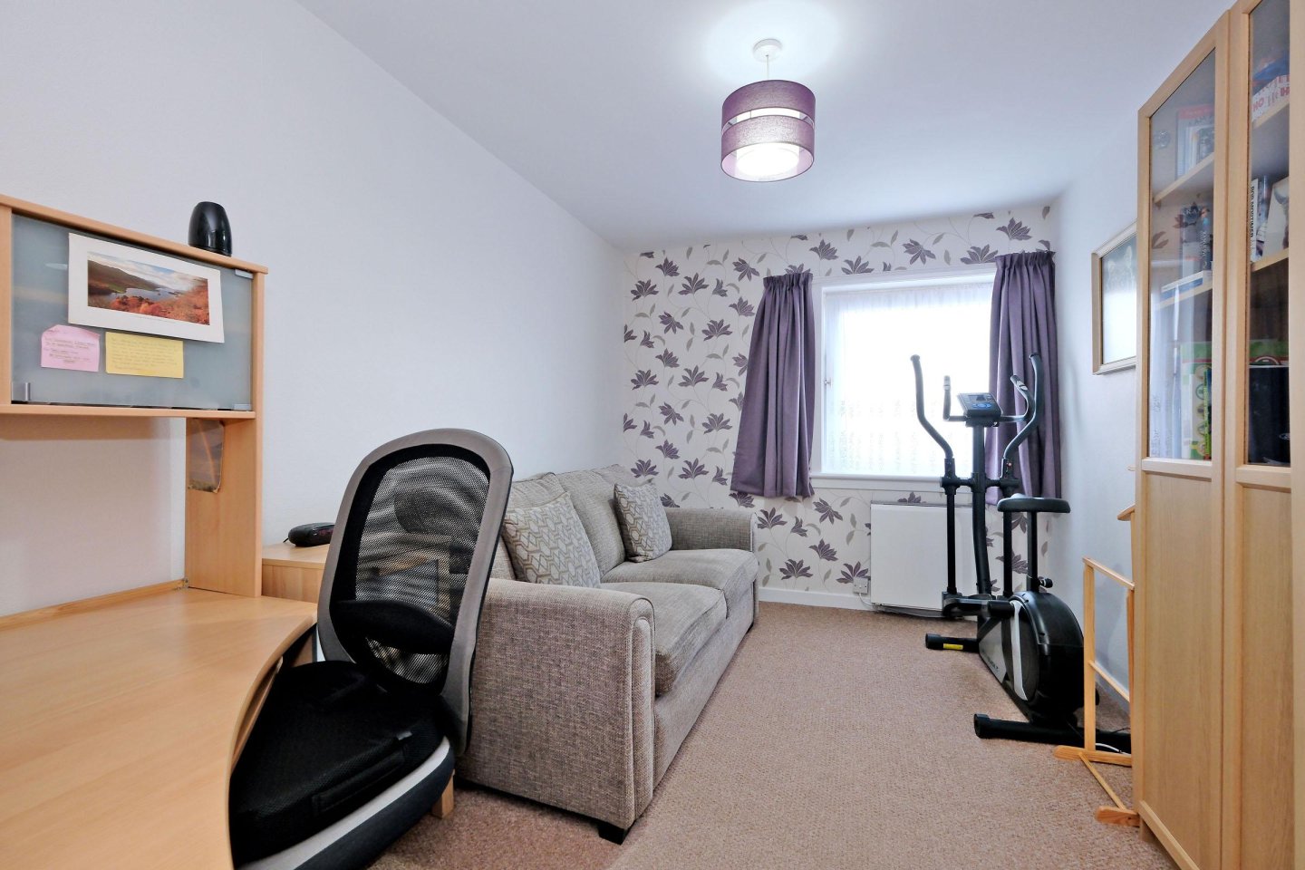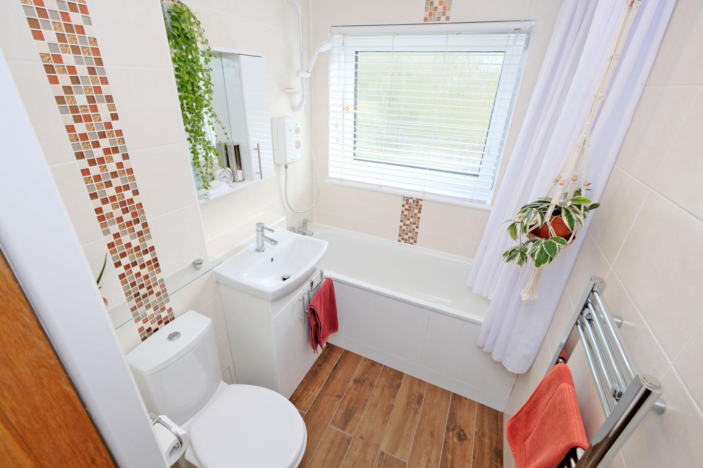 Family Bathroom: White three-piece suite with WC, wash hand basin set in white gloss vanity unit and bath with wall mounted Triton T80si shower and shower curtains. Frosted glass window with horizontal blinds. Cupboard with shelving. Laminate wood effect flooring. Dimplex storage heater. Chrome towel rail. Central light fitment. Ceramic tiling to ceiling height. Mirror/medicine cabinet. Usual fitments to remain.