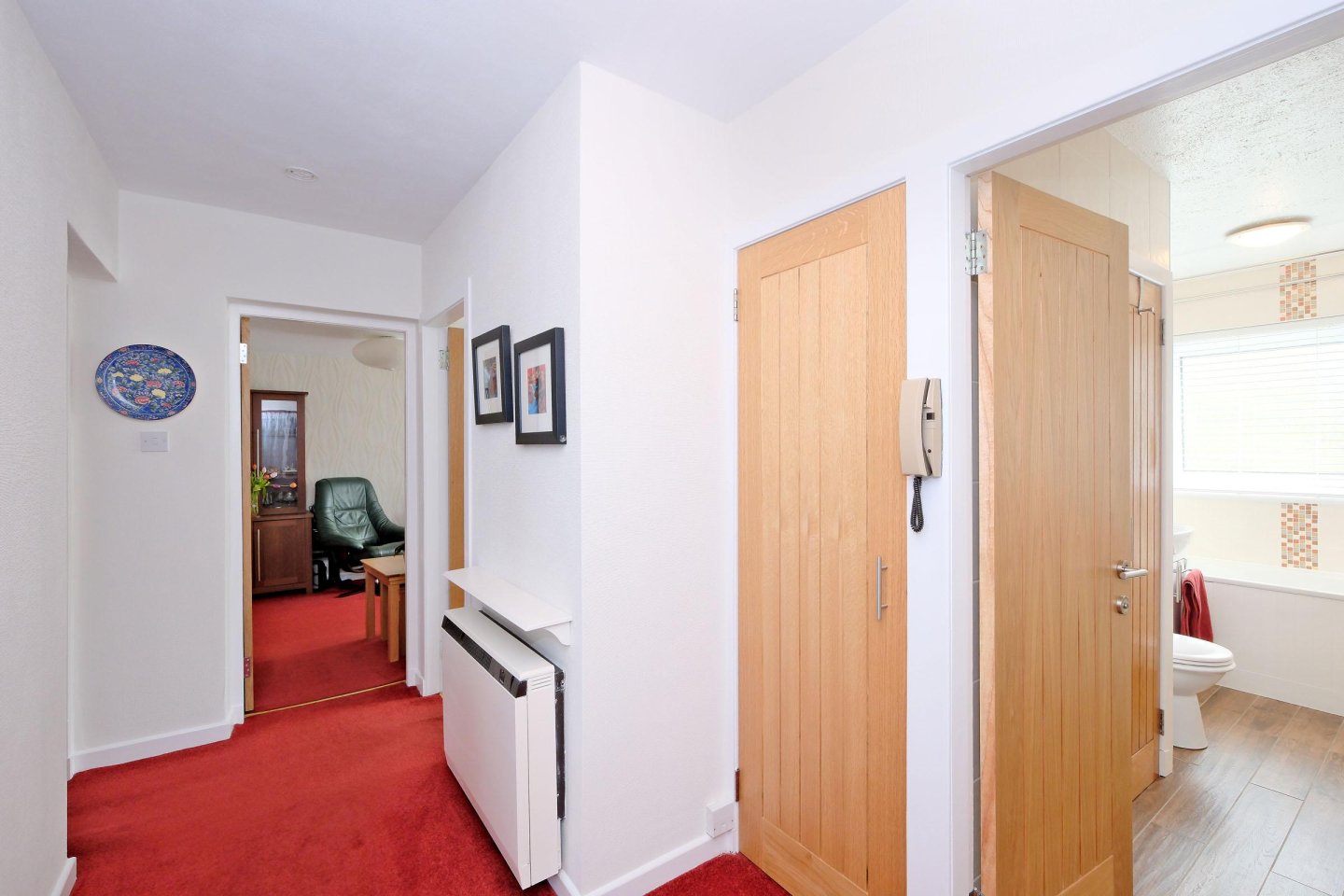 Hallway: A metal door, with a double glazed glass panel and frosted glass panel to the side, leads from the communal hallway into the Hallway. Airing cupboard housing the hot water tank. Low level cupboard housing the electric circuit meter. Fitted carpet. Dimplex storage heater. Central light fitment. Telephone point. Light oak panelled doors lead into the rooms.