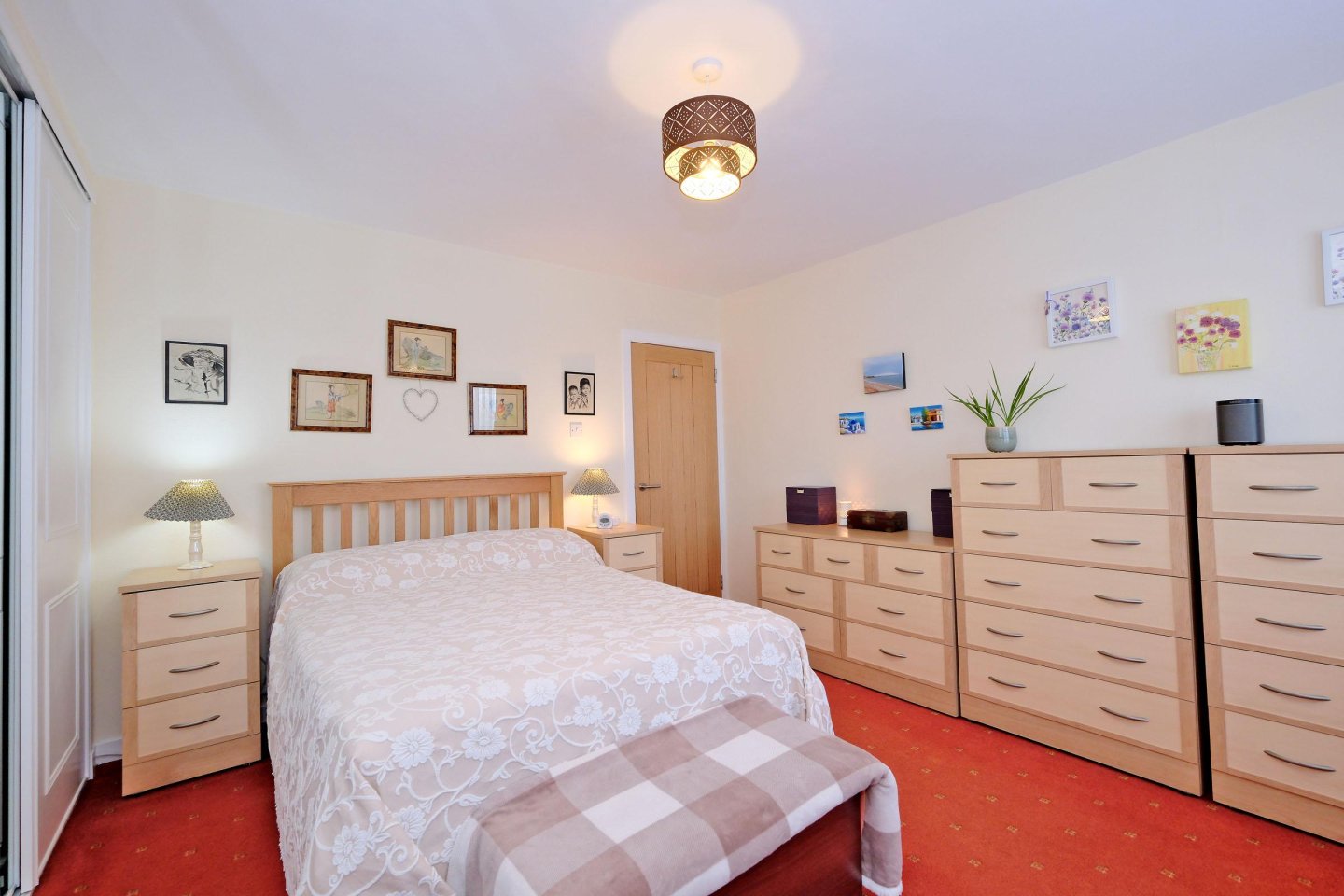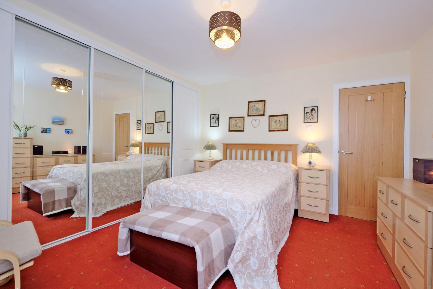 Double Bedroom One: 3.94m x 3.40m (12’11” x 11’2”) approx. Window, with curtains and net curtain to the rear. Wall to wall fitted wardrobes, with hanging rails and shelving, and mirrored sliding doors. Fitted carpet. Dimplex storage heater. Central light fitment.