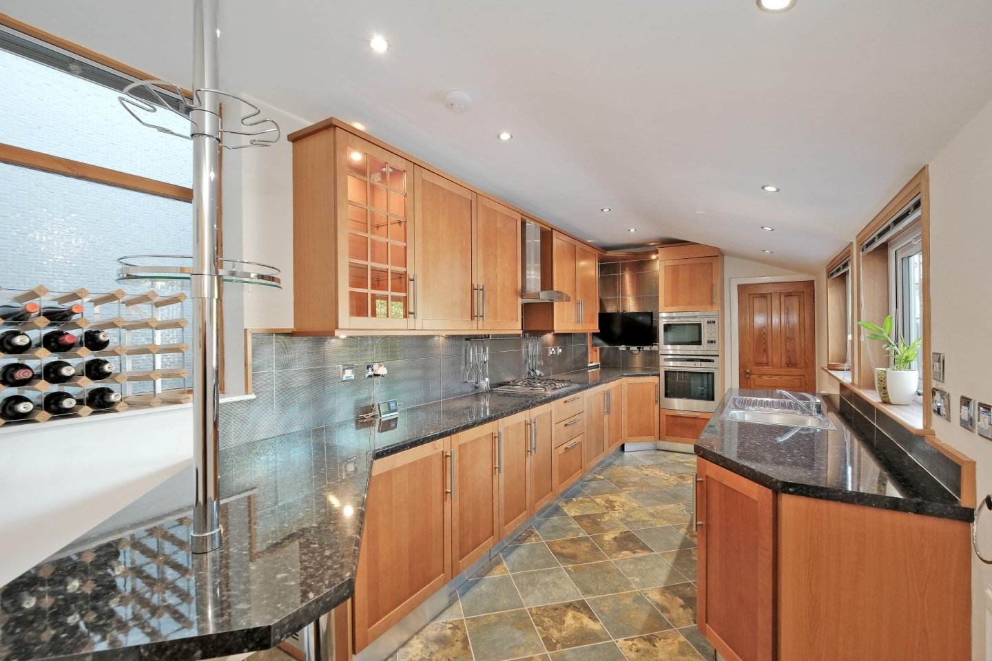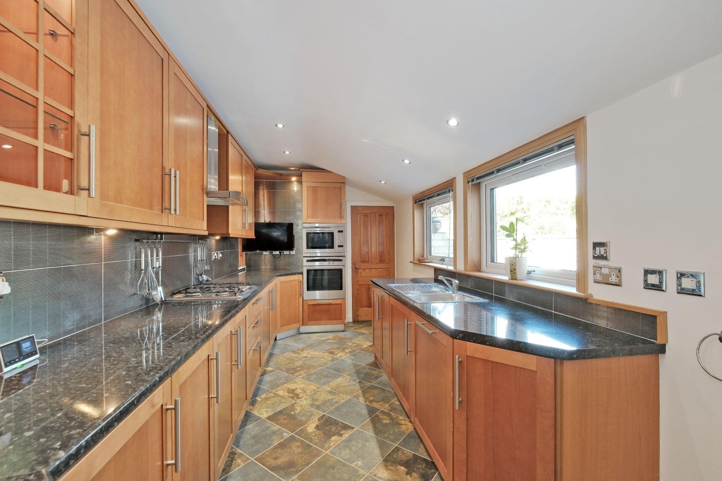 Kitchen: 7.92m x 2.4m (26’0" x 8’0") approx. The kitchen was recently installed and is both stylish and well thought out. Twin windows overlooking the Rear Garden with further side facing window. Venetian blinds. Fully fitted with a range of quality base and eye level storage units with Cherrywood cabinets and contrasting dark granite effect worktops incorporating a breakfast bar. Ceramic tiles behind worktops. Slate floor tiles. Stainless steel sink and drainer with mixer tap. NEFF gas hob with stainless steel chimney style extractor hood above. Integrated NEFF combination oven/microwave with separate oven below. Integrated NEFF dishwasher. Integrated fridge with freezer drawer. Hotpoint washing machine. Twin radiators. Ceiling downlighters. Complimentary unit lighting and wall lights. Central heating timer. Ample power points. Doors to Dining Room and Rear Vestibule.