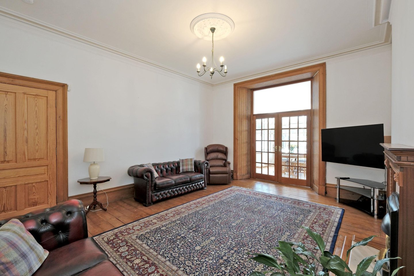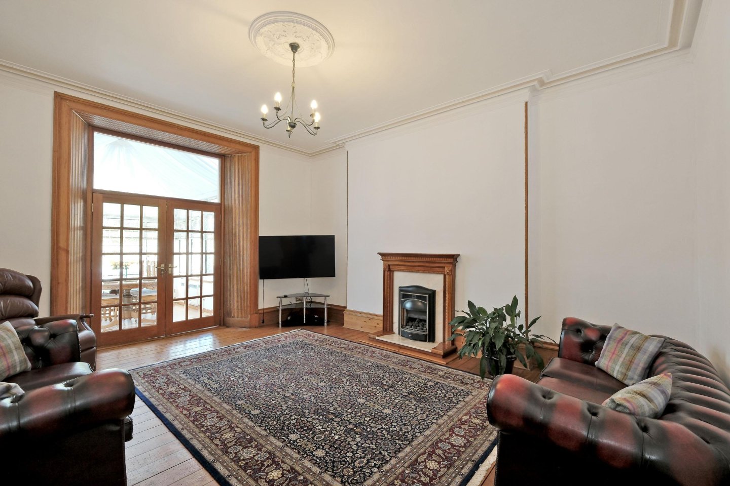 Lounge: 5.79m x 4.4m (19’ 0" x 14’9") approx. A well proportioned public room with glazed French Doors to Conservatory. Twin alcoves. Living Flame gas fire set on marble hearth with decorative wooden mantelpiece. Plaster cornicing with matching ceiling rose. Wooden floor. Radiator. Ample power points. TV aerial point. NB TV to be removed.