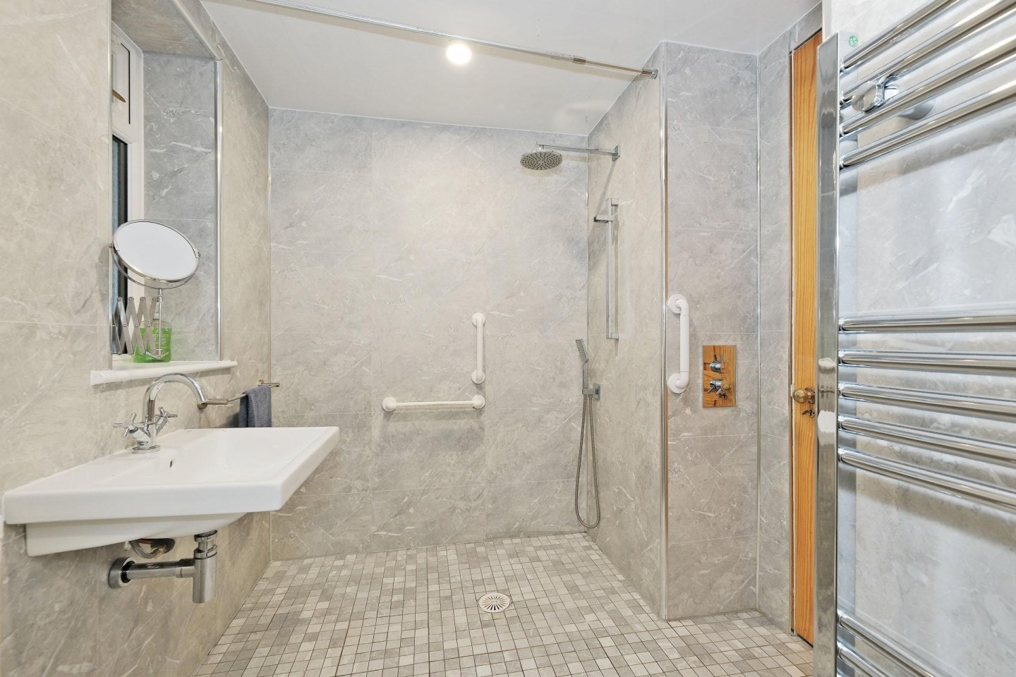 Wet Room: 2.31m x 2.13m (7’7 x 7' 0") approx Recently upgraded with a white wc and wash-hand basin. Full ceramic wall and floor tiling. Opaque glass side facing window. Dual-head shower. Chrome ladder style heated towel rail. Large understairs storage cupboard housing the central heating boiler. Mirror fronted Medicine Cabinet. Extractor fan. Ceiling downlighters.