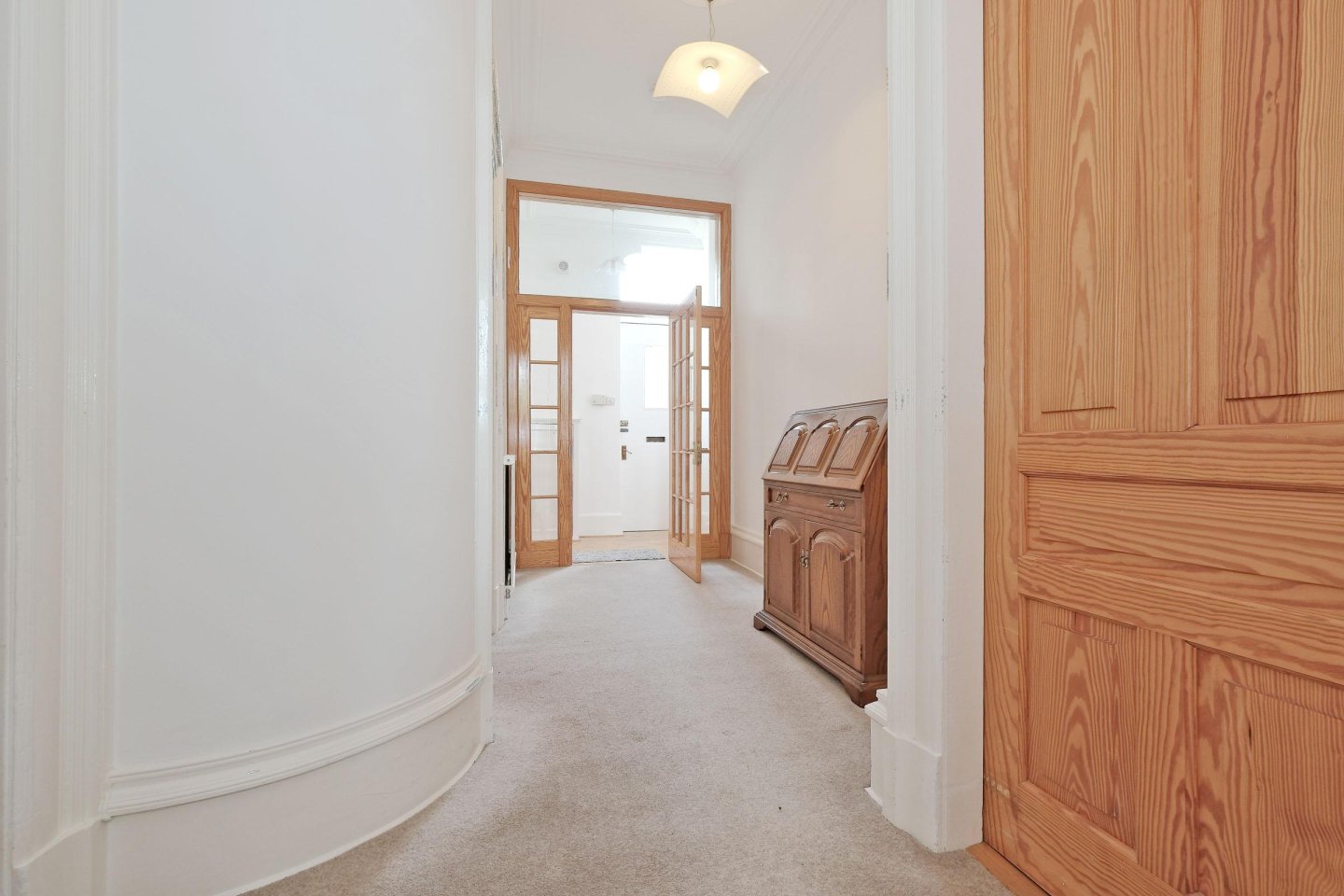 Entrance Vestibule: Hardwood front door with glazed panel. Wooden floor. Meter cupboard. Ceiling cornice. Ceiling light. Multi-pane glazed door to Hallway.
