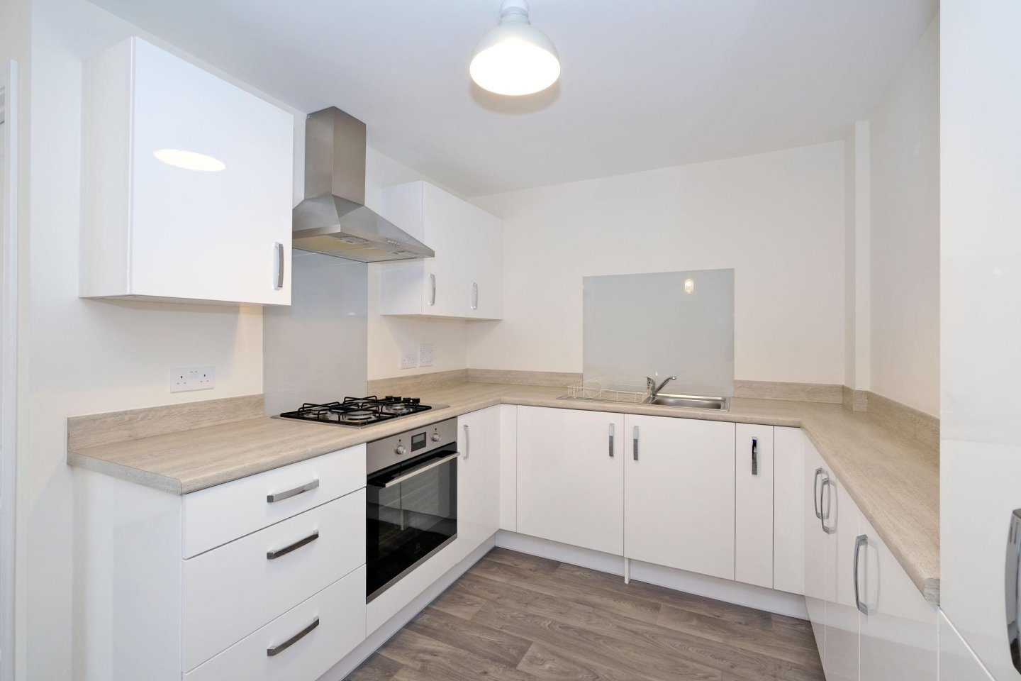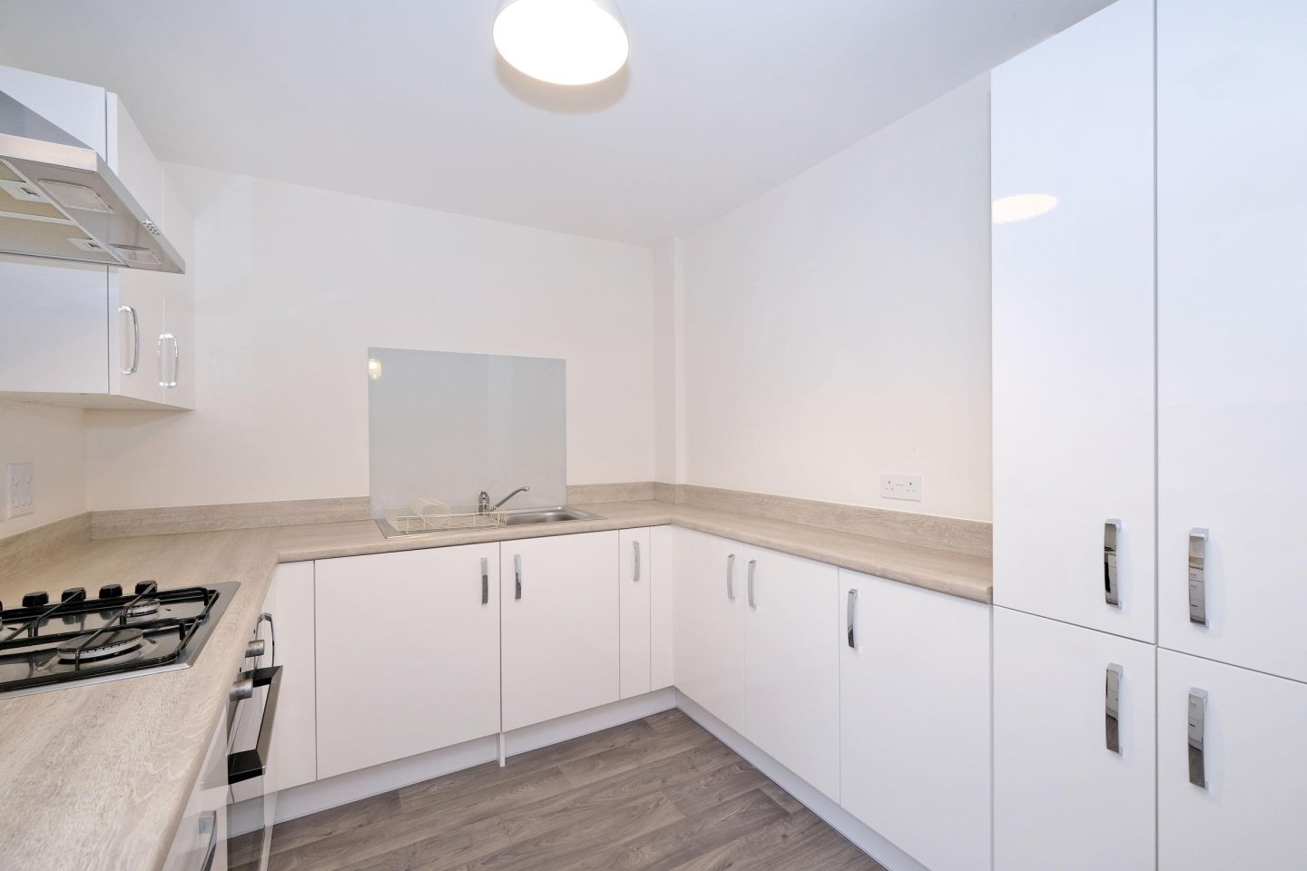 Kitchen: 2.34m x 2.26m (7’8” x 7’5”) approx. Ample white gloss wall and base units with contrasting worktops and splashback tiling. Integrated Electrolux oven and four ring gas hob and chimney style extractor fan. Integrated Electrolux fridge freezer. Plumbed for dish washer. Stainless steel sink, drainer and mixer tap. Same vinyl wood effect flooring. Central light fitment. Two double power points in addition to those for appliances.