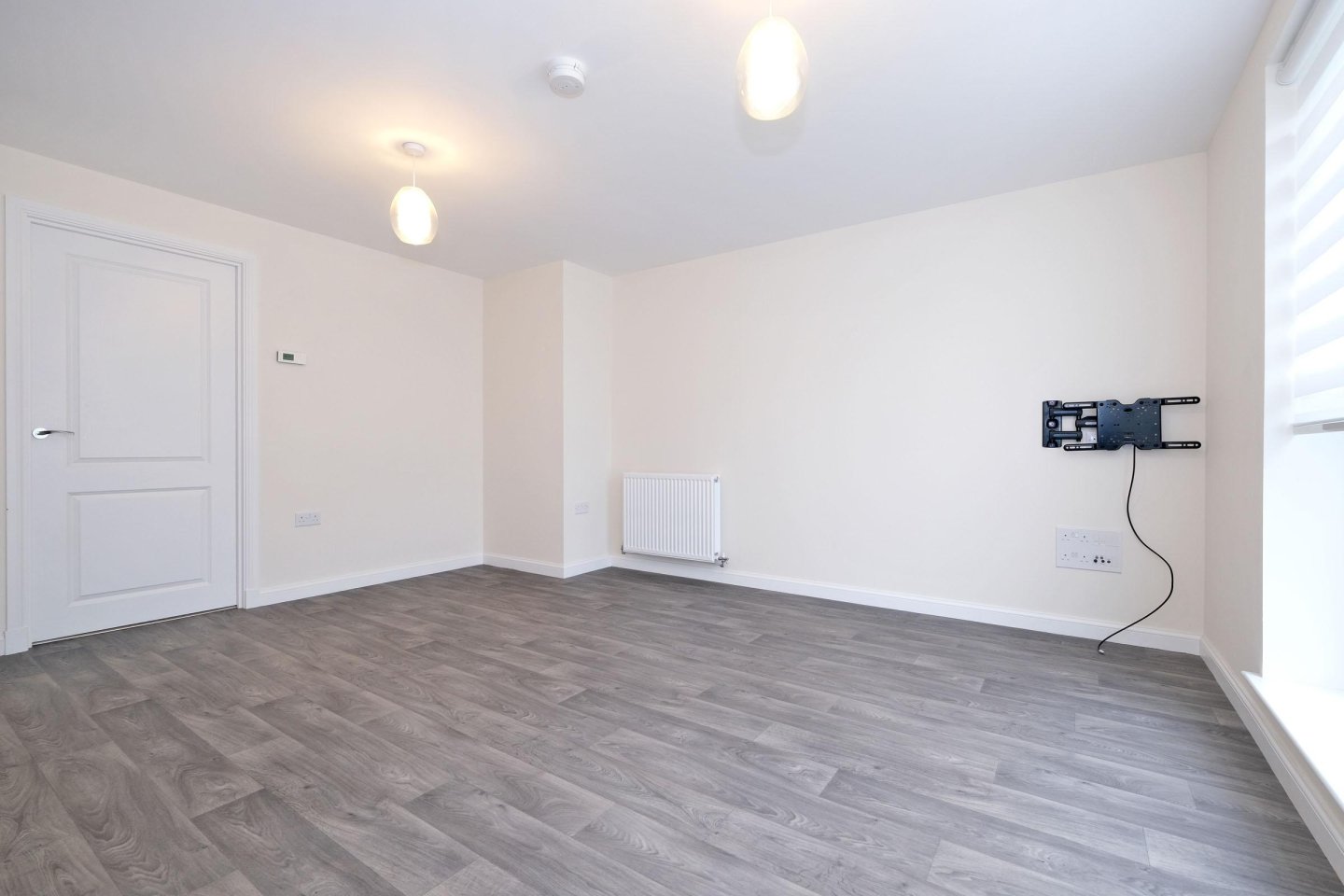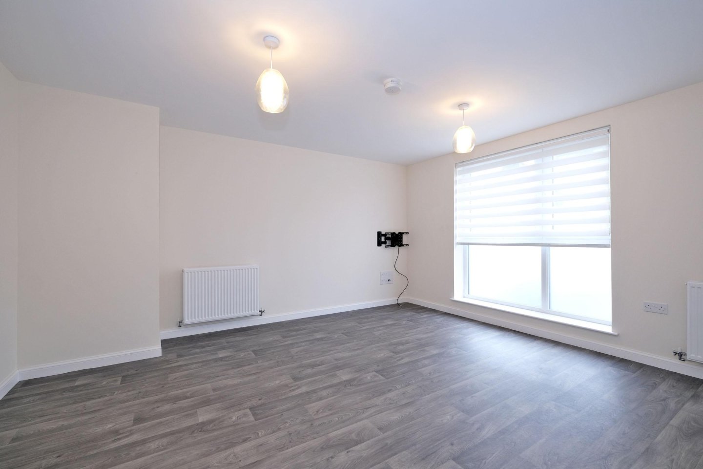 Lounge: 4.44m x 3.96m (14’7” x 13’) approx. Window, with lower half frosted windows and night and day blinds, overlooking the front. Vinyl wood effect flooring. Two double radiators. Two central light fitments. Media panel. Four double power points. TV bracket to remain. Open plan with the Kitchen. White panelled door leads into the Rear Hallway.
