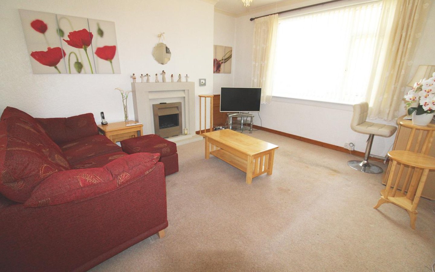 The living room is a bright room with a front-facing window overlooking the garden. An electric fire sits within a stone effect fire surround with an alcove to the side. The living room is finished with a fitted carpet.