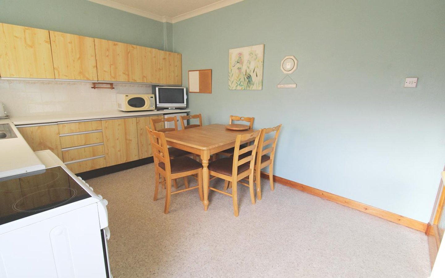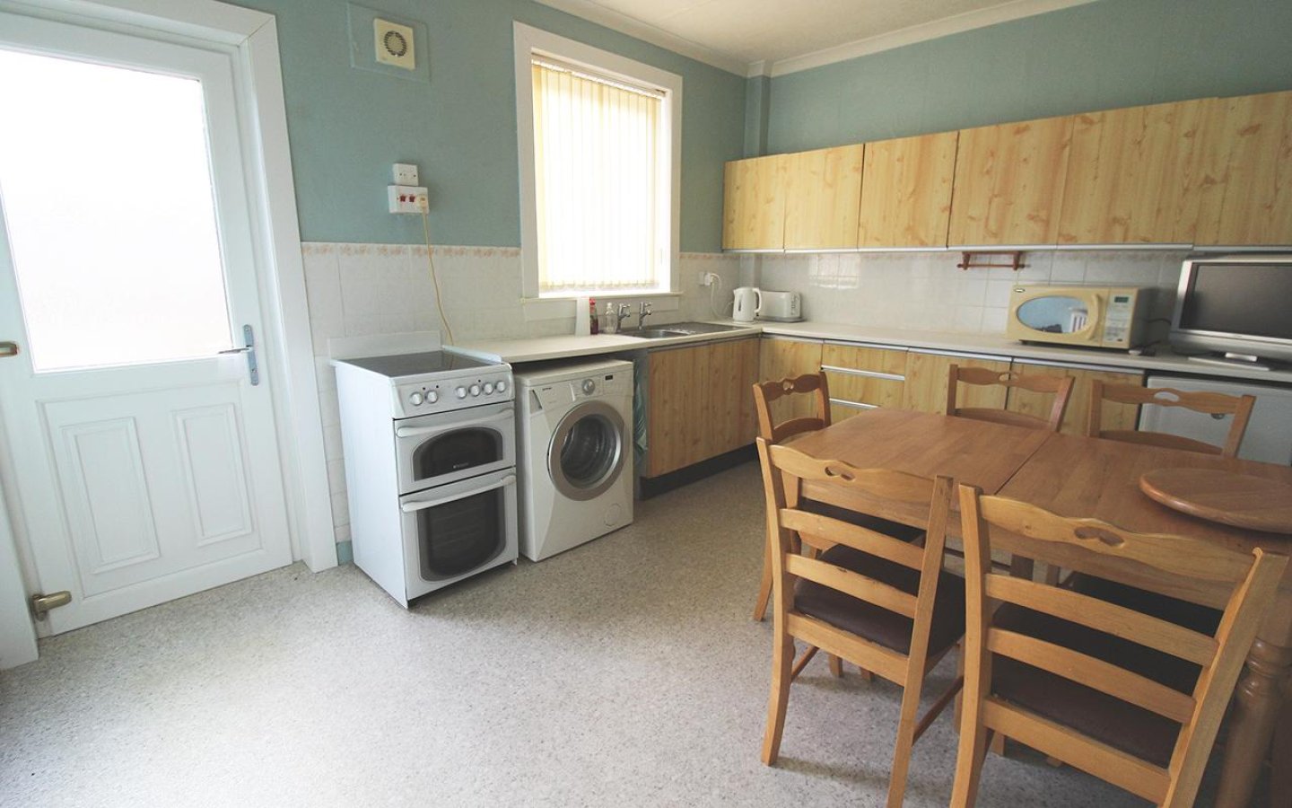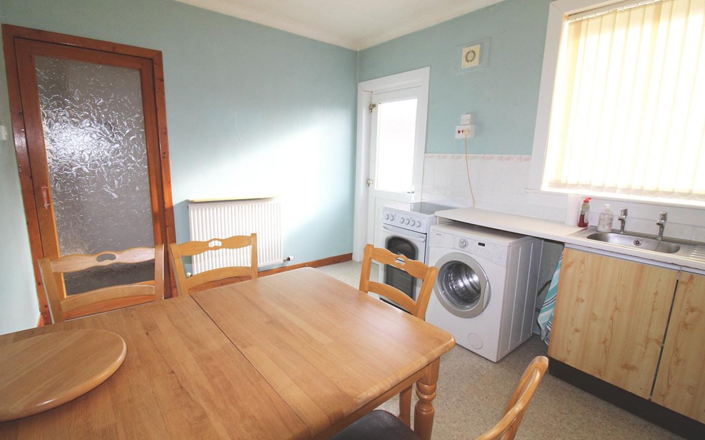 The dining kitchen is fitted with a range of base and wall mounted units with contrasting worktop and tiled splashback. The electric cooker, washing machine, and fridge are included in the sale. A stainless steel sink with drainer sits below a window overlooking the large rear garden. The room is finished with vinyl flooring, and a glazed uPVC door leads directly into the garden.