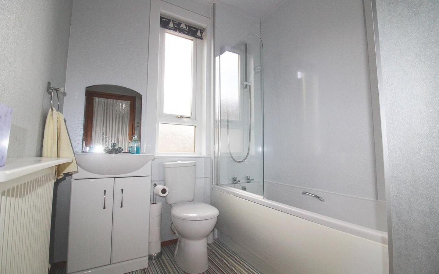 The recently modernised bathroom is fitted with a white suite comprising WC, wash hand basin set atop a storage cupboard and bath with electric mira shower. Aqua panelling is fitted around the shower and sanitaryware. The room is finished with spot lighting, striped vinyl flooring, usual bathroom accessories and a frosted window to the rear.