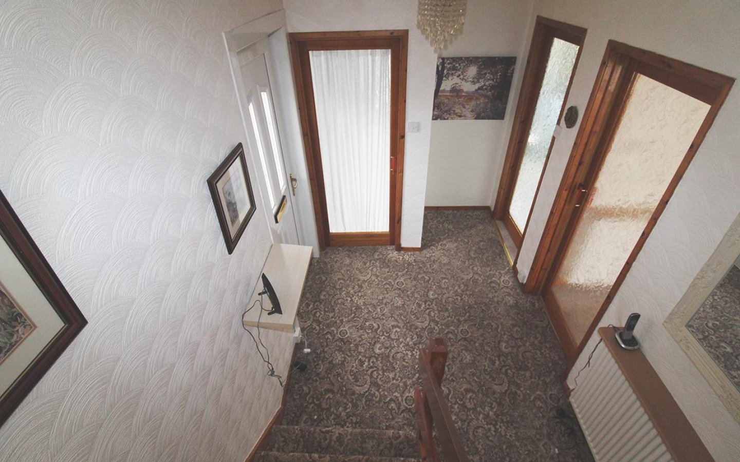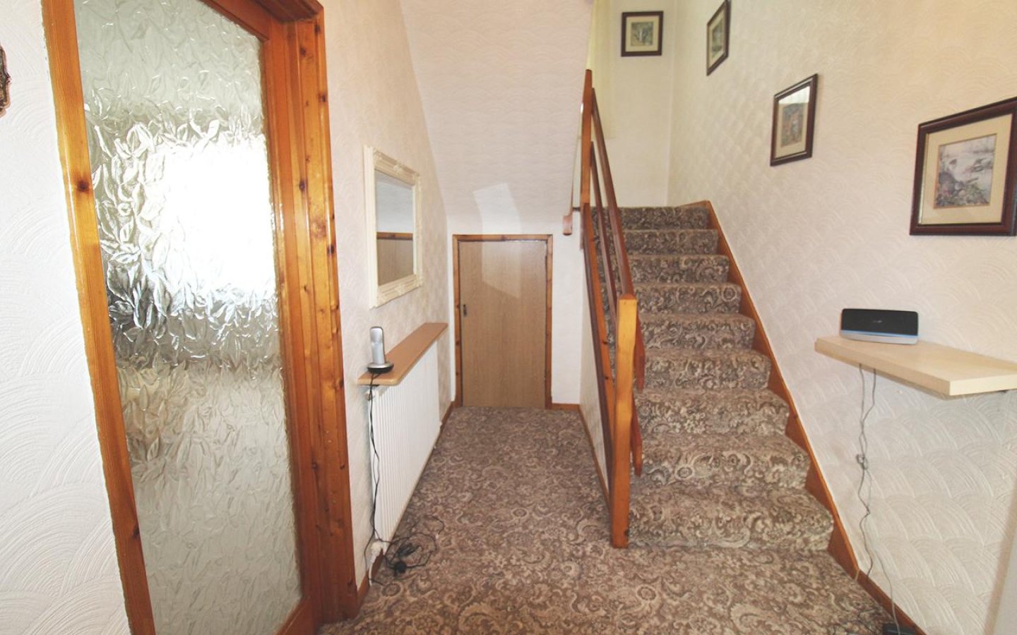 Access is via a glazed uPVC door into the carpeted entrance hall, which provides access to the living room, dining kitchen, bathroom, and staircase to the first floor. The hall has a large storage cupboard.