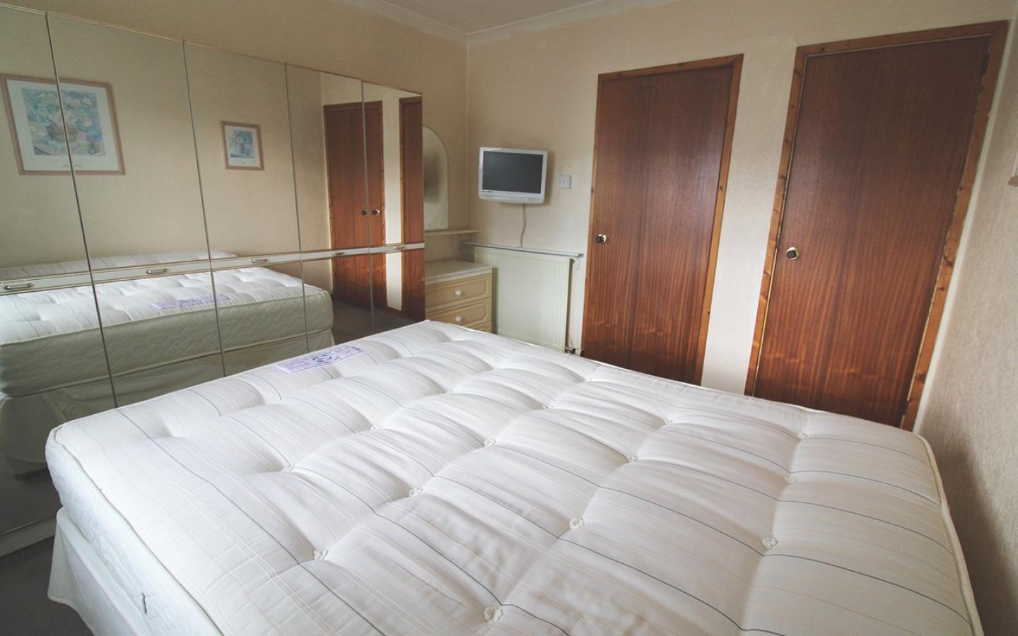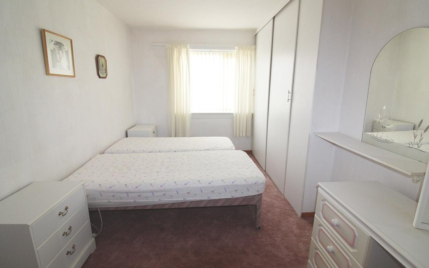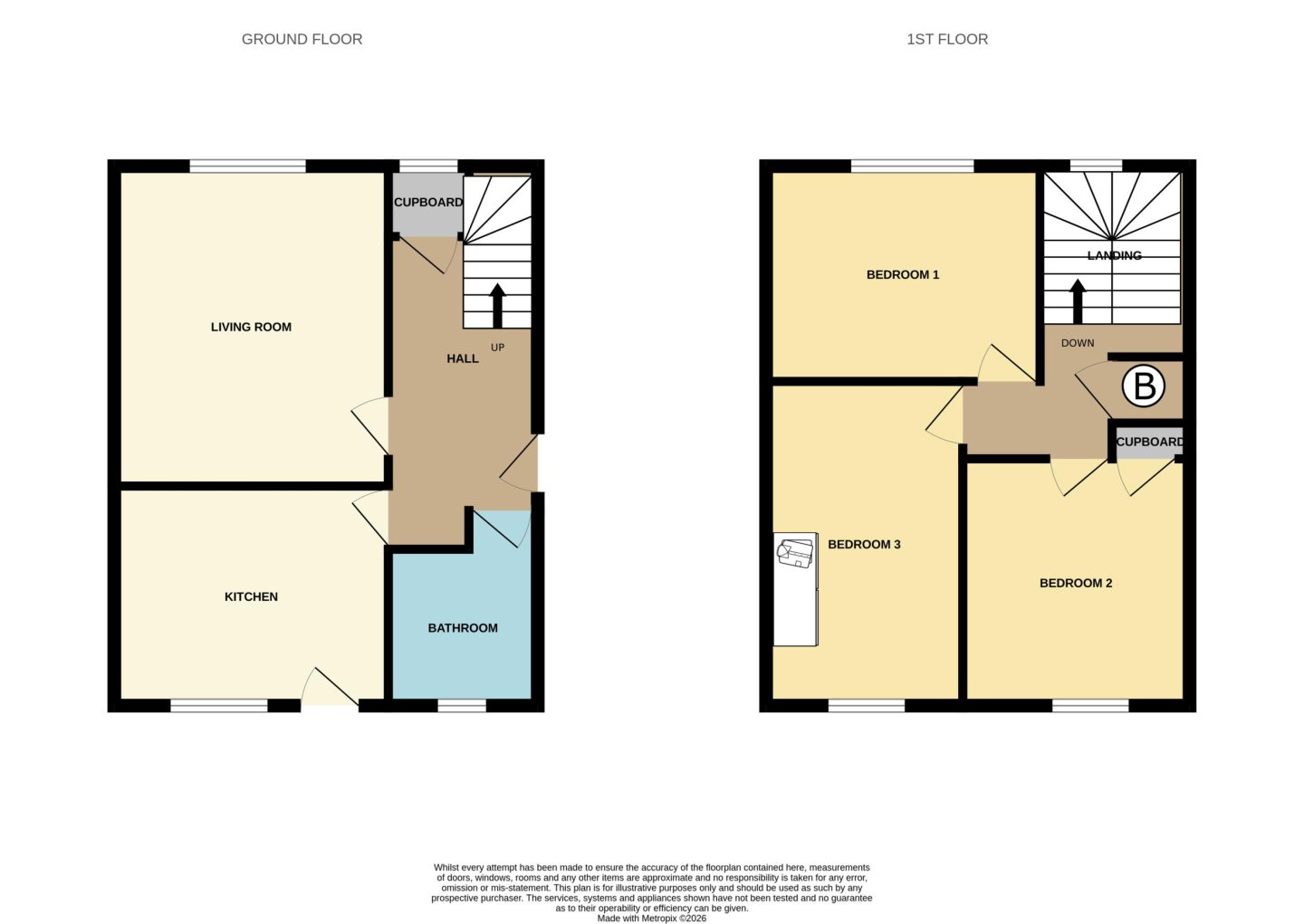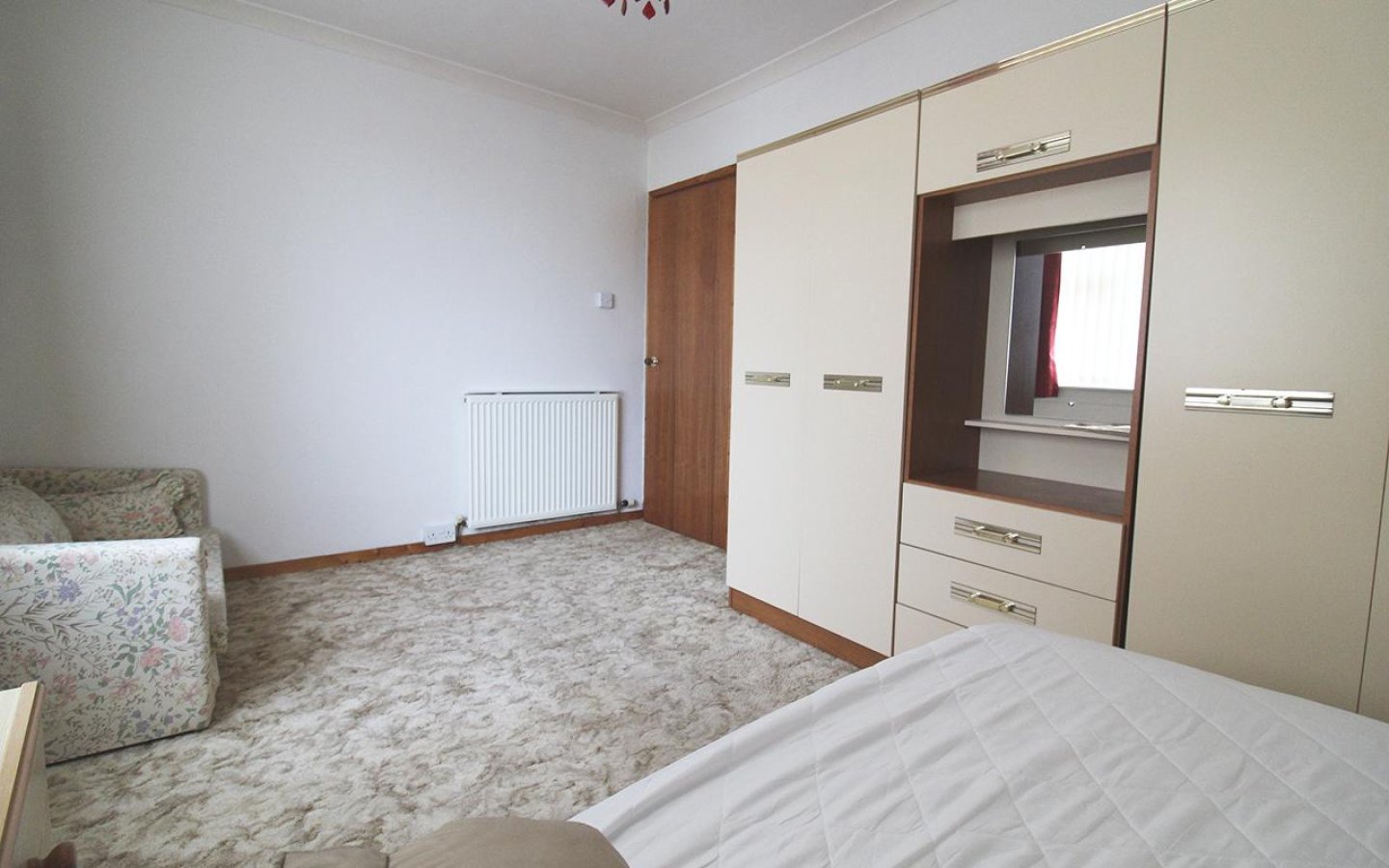 A carpeted staircase with wooden balustrade and handrails leads to the first floor landing. A large cupboard on the landing houses the boiler. Bedroom 1 is front-facing and has a built-in cupboard and a fitted carpet. Bedrooms 2 and 3 are both rear-facing with fitted carpets. Bedroom 3 has built-in wardrobes with sliding doors.