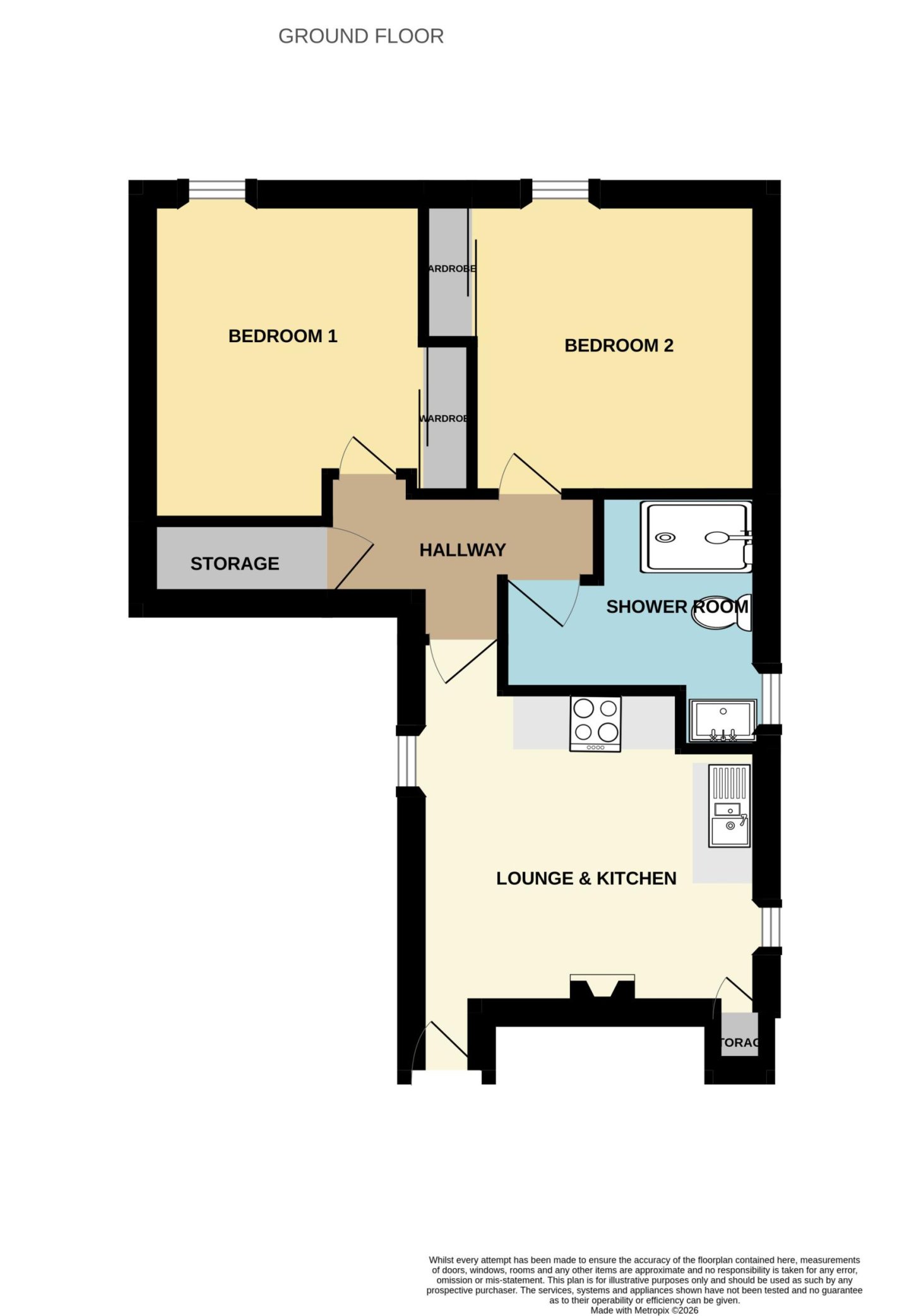Hallway – Accessed via the kitchen, the hallway gives access to 2 bedrooms, shower room, large storage cupboard and loft hatch. Loft is partially floored and houses the boiler.