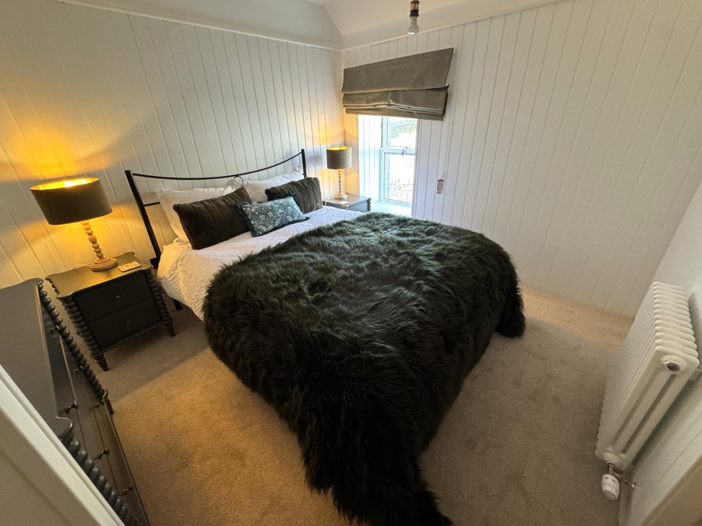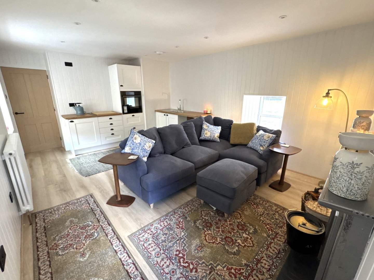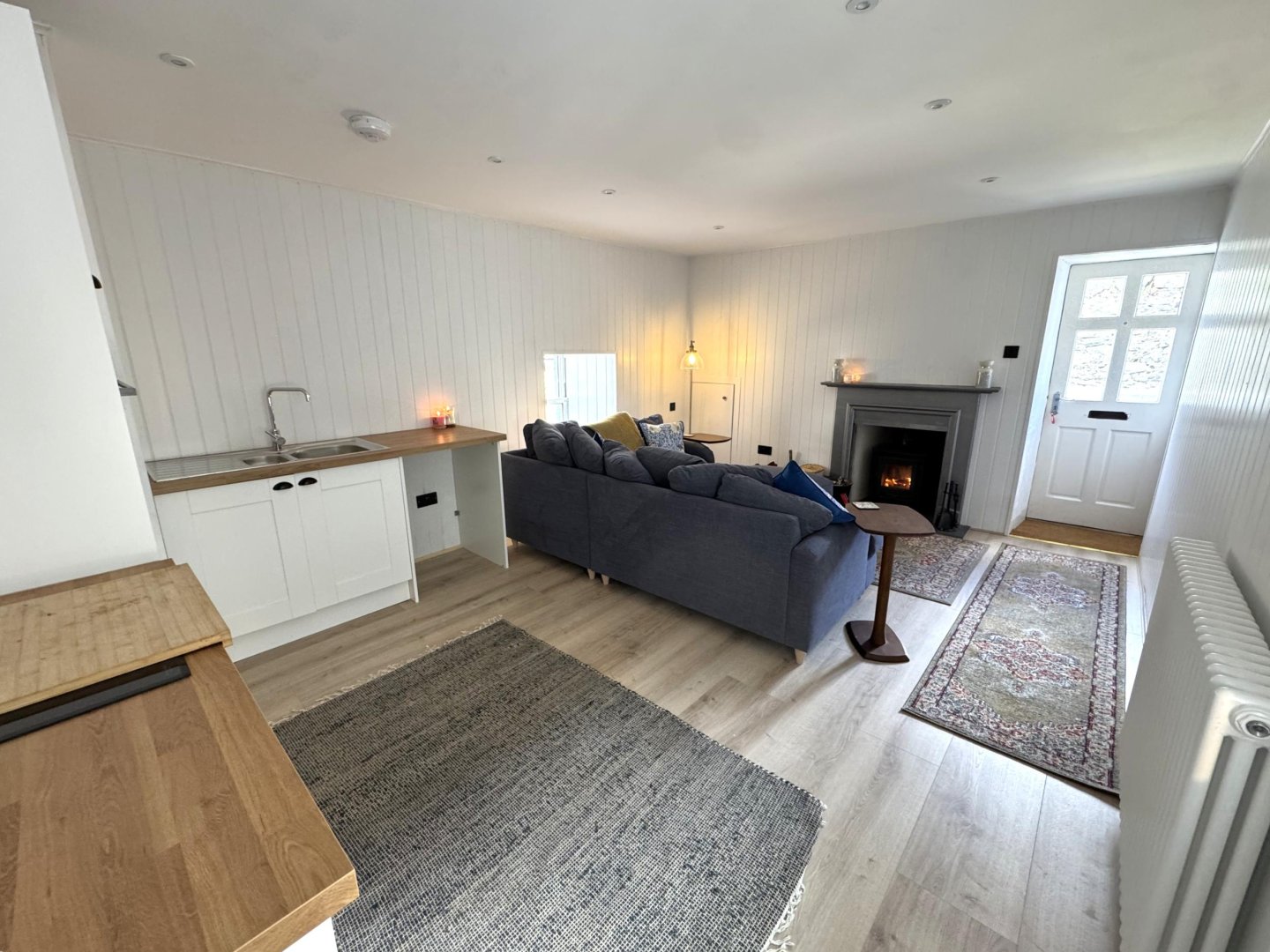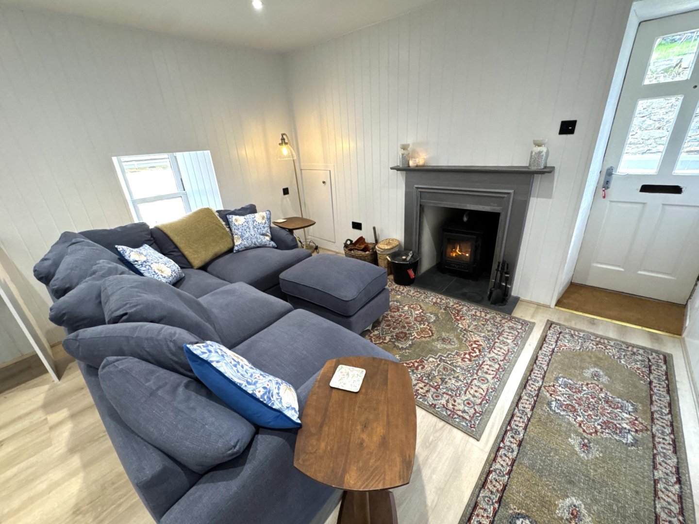 Two side windows both providing natural light. There is a small cupboard housing the electrics. The woodburning stove is the focal point of the room.