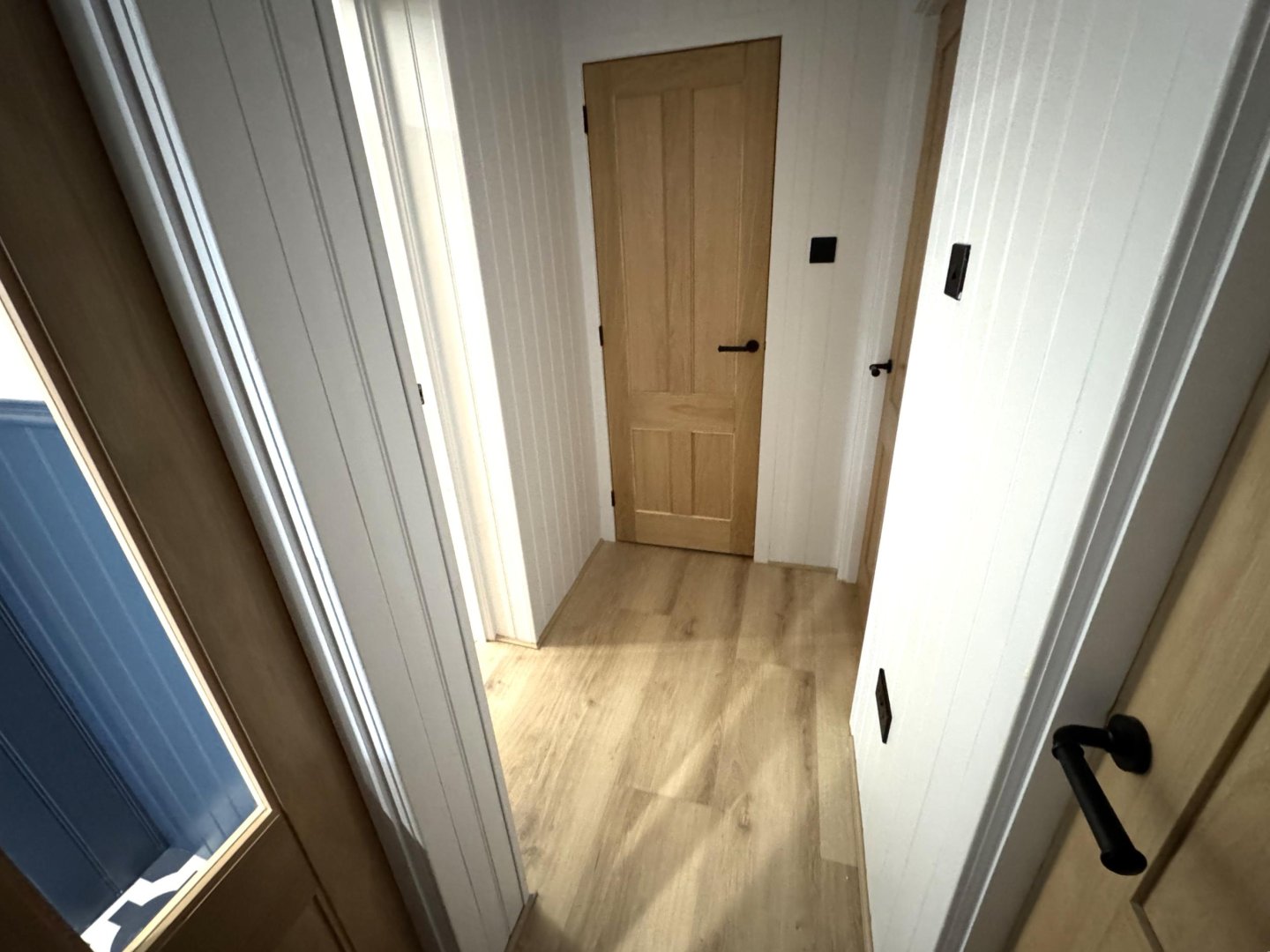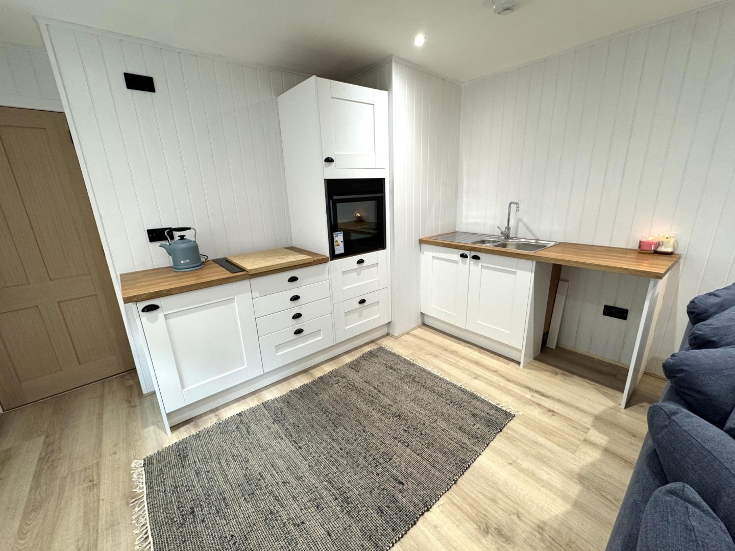 Entry – Entry is gained via a step to the partially glazed rear exterior door into the open plan lounge and kitchen area.