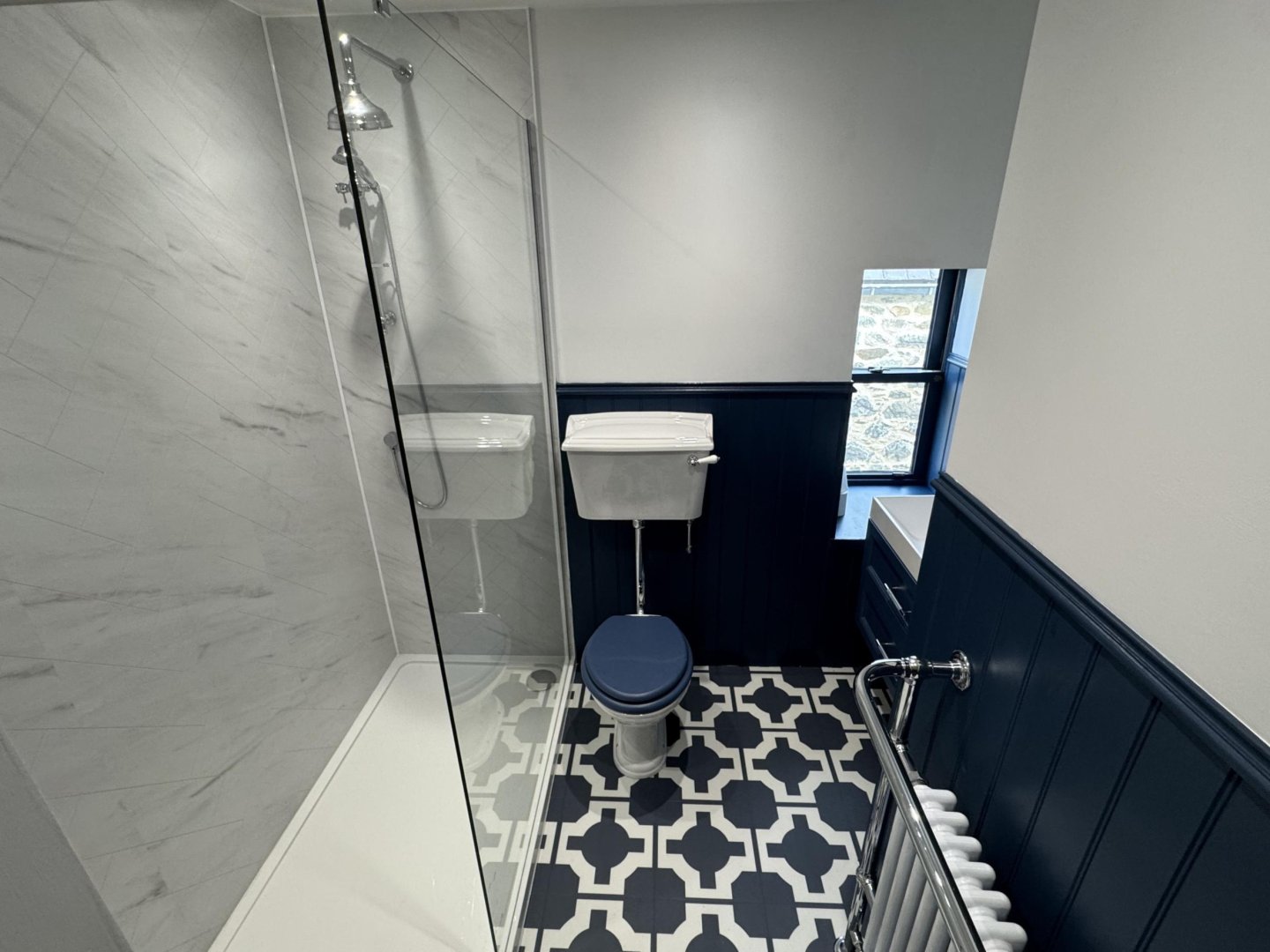 The modern shower room consists of a 3-piece suite of W/C, rectangular sink with 2 retro style taps, a large walk-in shower unit with 2 shower heads and shelving alcove. A side facing window provides natural light.