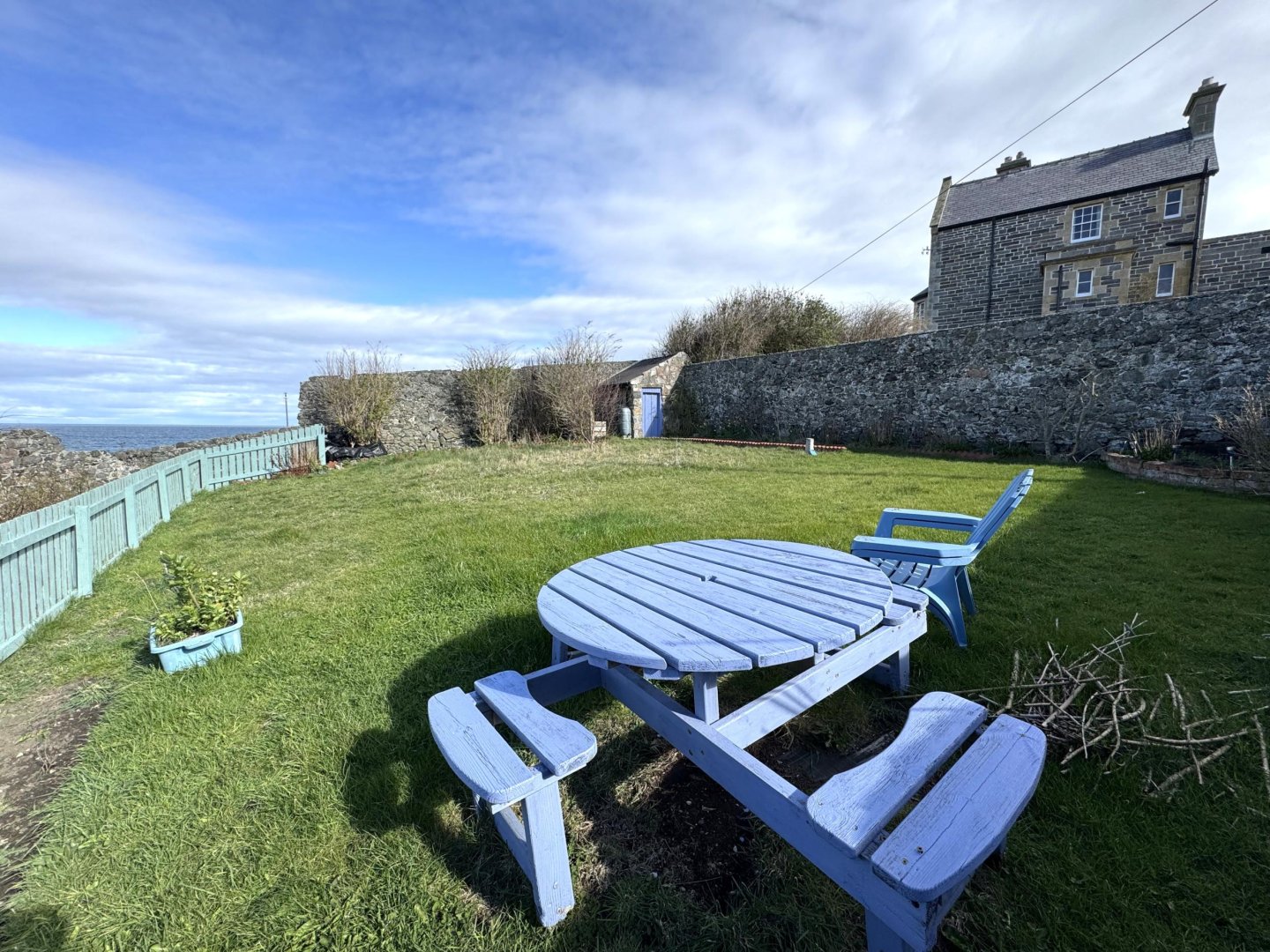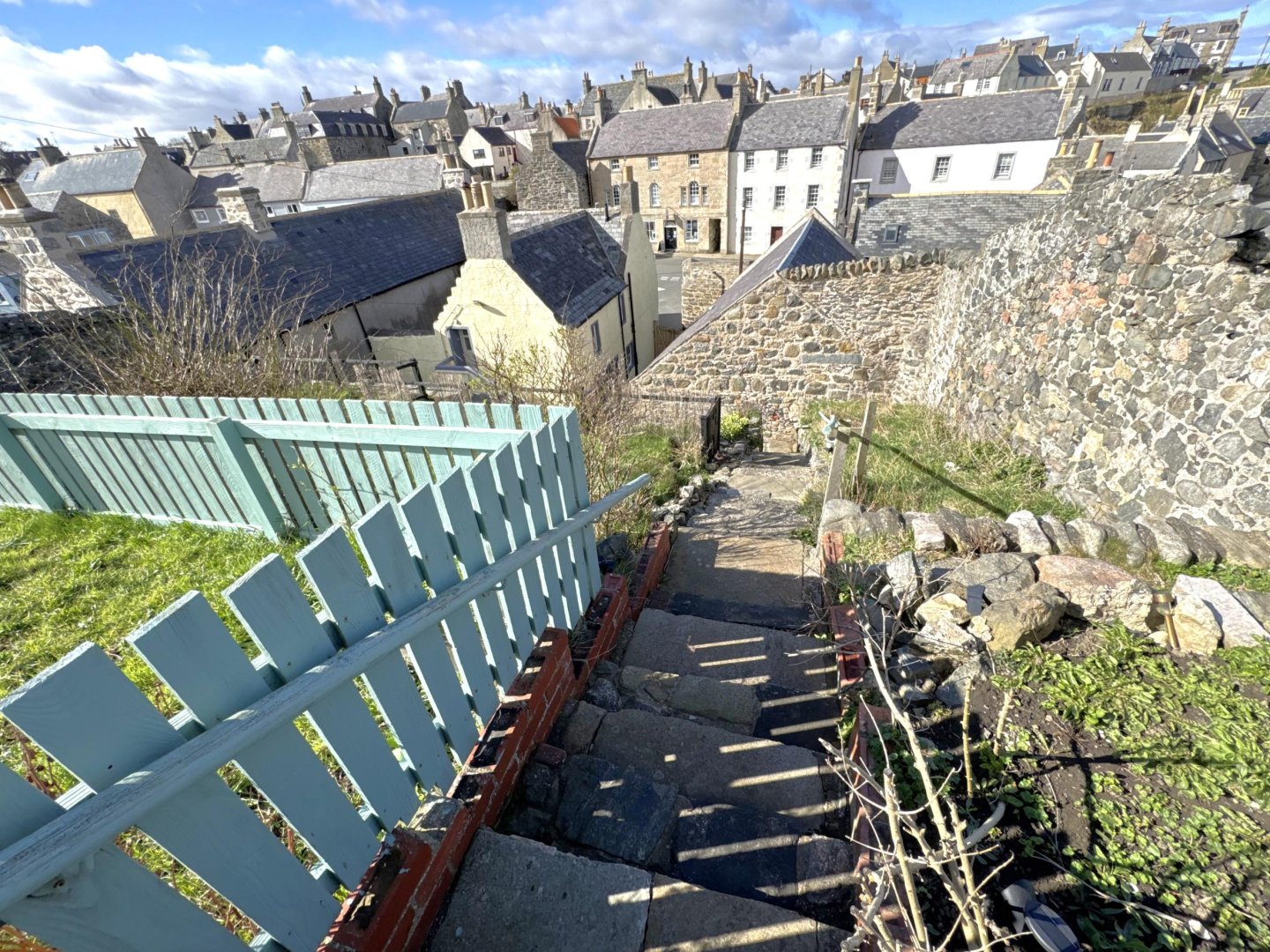 Outside – The property benefits from side and rear gardens. The front gate from Church Street gives you access to the side courtyard garden area, which then takes you to the second gate into the large rear courtyard area. Steps lead up to the entrance door. There is a small wood store with power and light under the entrance steps, next to this is the gas meter. To the side of the courtyard garden there are multiple steps which takes you to the large fenced off garden area. This area is mainly laid to lawn and partially with flower beds. There is a small garden shed and a large compost area. This garden area has amazing sea and harbour views.