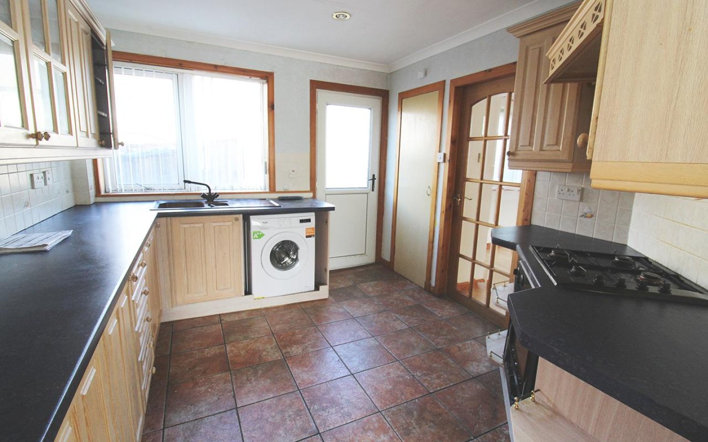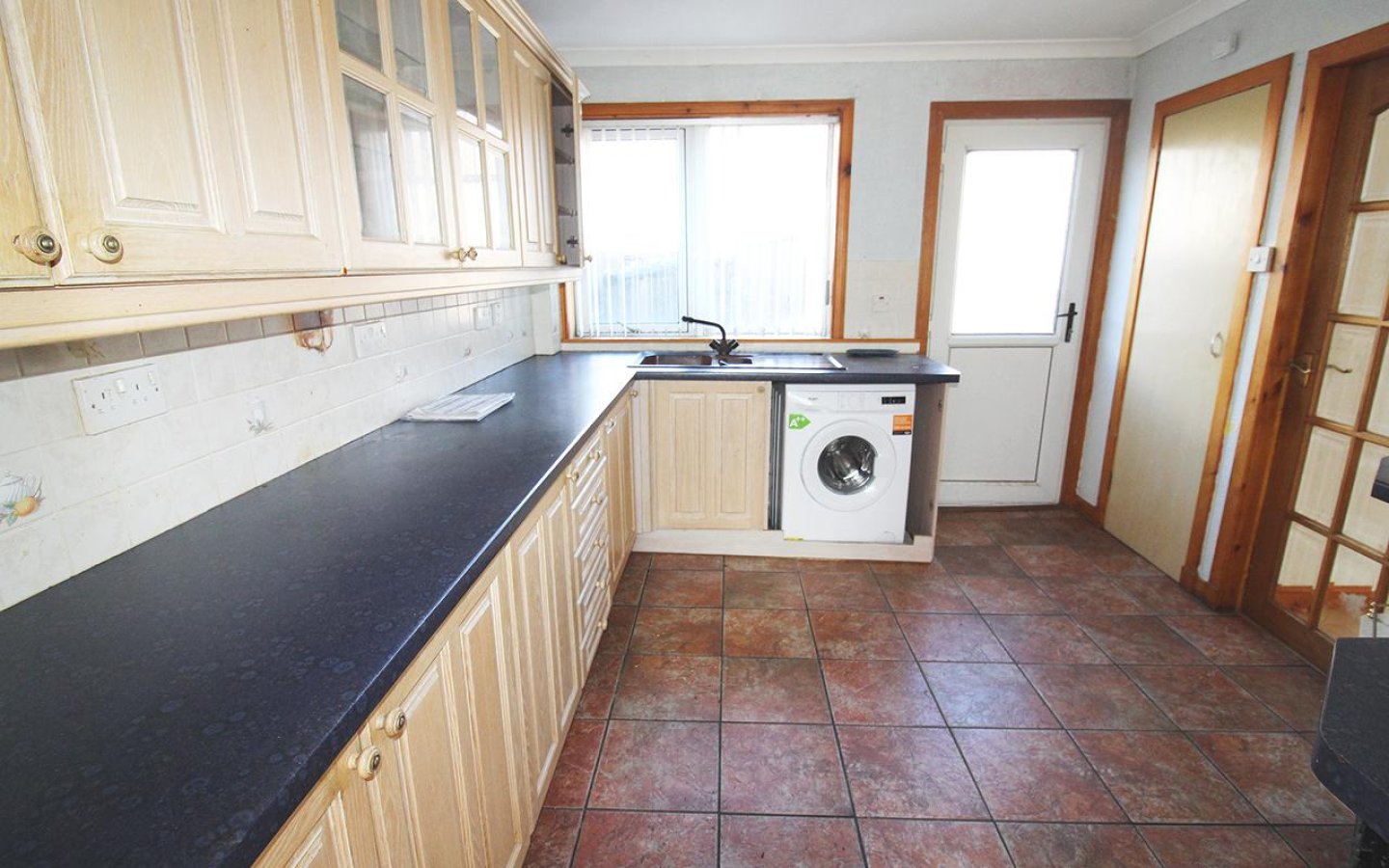 The property is accessed via a glazed uPVC door into the hall which accesses the living room and staircase to the first floor. The living room is a lovely bright room with windows to the front and rear. Within the living room is a tiled fireplace, built-in tv unit, storage cupboards and a wall mounted mirror. A glazed door from the living room leads into the kitchen.
