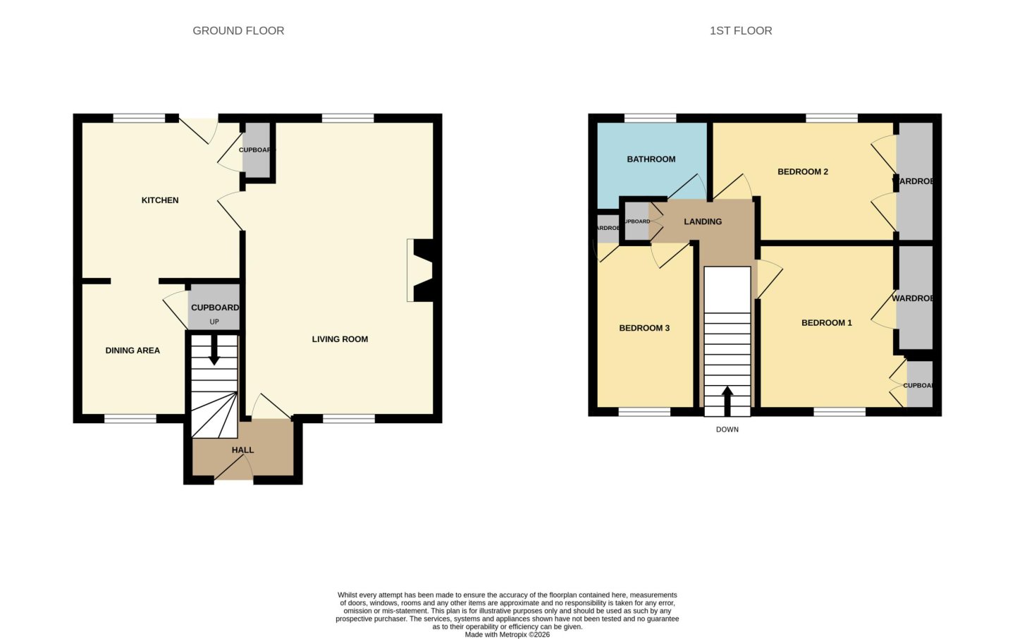 The staircase leads to the first floor landing which accesses the three bedrooms and bathroom. Also on the landing is a built-in cupboard. Bedroom 1 has a window to the front and has two built-in cupboards. Bedroom 2 which overlooks the rear garden has a two fitted wardrobes. Bedroom 3 is front facing and has a built-in wardrobe and laminate flooring.