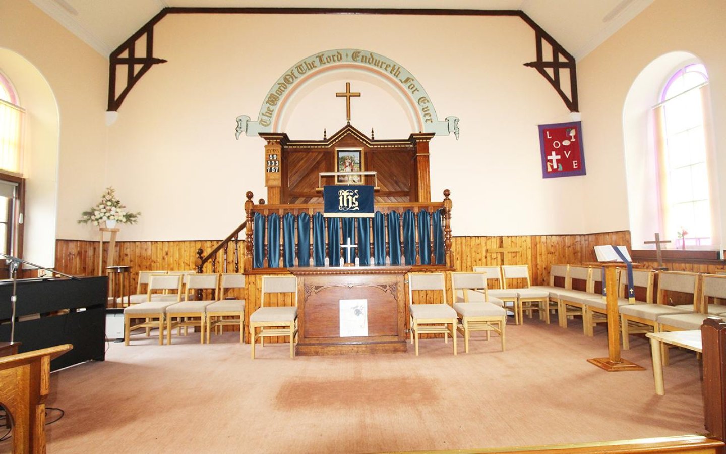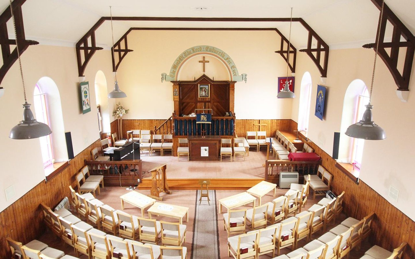 The hall is a bright space with a vaulted ceiling and stained glass windows on three sides, flooding the room with natural light. The walls are timber lined to dado height. A raised stage leads to the pulpit as well as the fire escape. Large shelved cupboard.