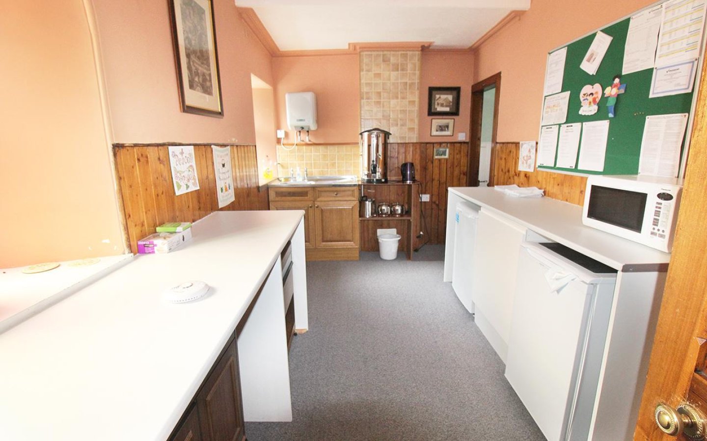 The church is accessed via traditional wooded double doors with curved window above. The walls are timber clad to dado height. The vestibule accesses the congregation hall, the wooden staircase to the gallery and the kitchen. Under stair cupboard.