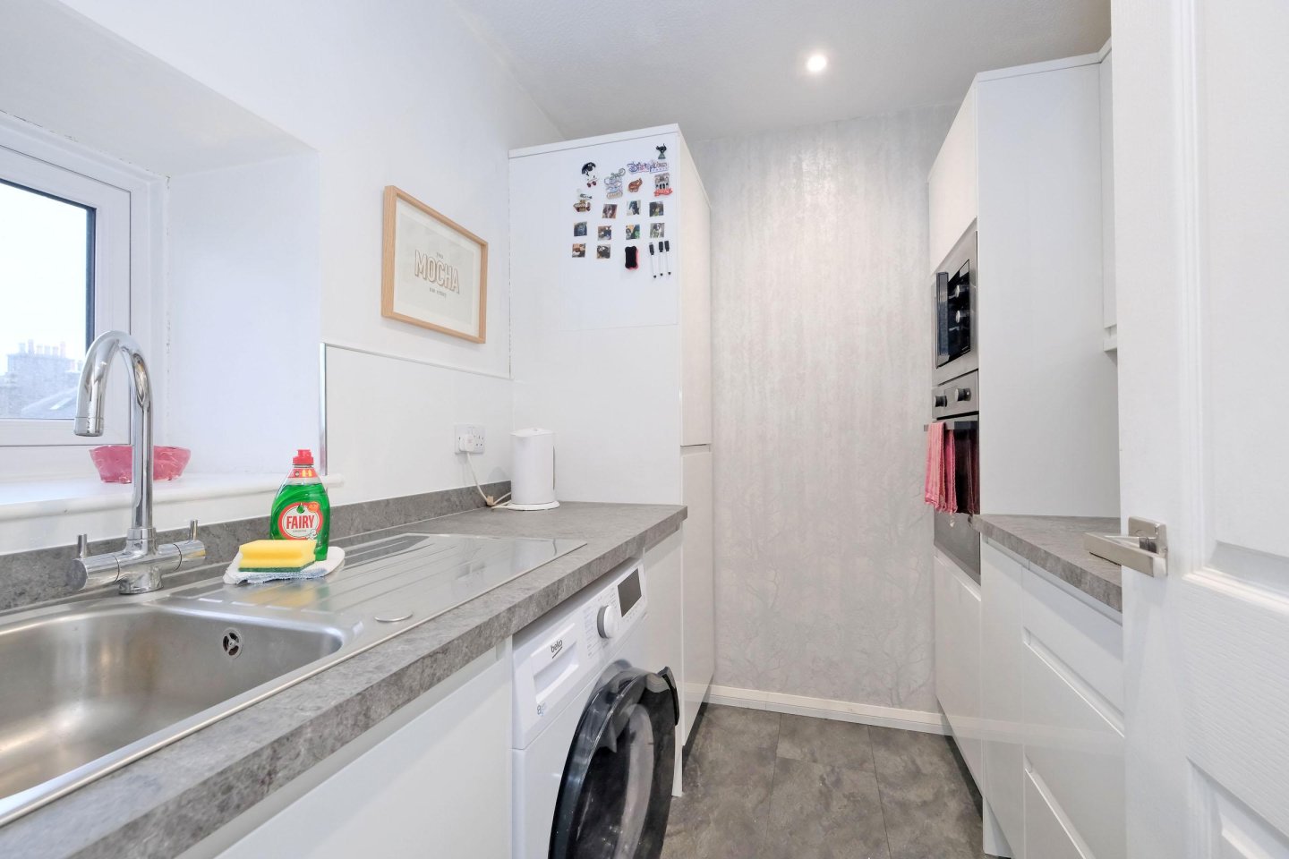 Kitchen: 2.36m x 2.01m (7’9” x 6’7”) approx. Ample white gloss wall and base units with contrasting worktops and splash backs. Stainless steel sink and drainer with mixer tap. Integrated Lamona oven/grill, microwave and four ring electric hob with chimney style extractor fan. Integrated Lamona fridge freezer. Beko washing machine/tumble dryer to remain. Window with deep sill to the side. Ceramic tiled flooring. Recessed spotlights.