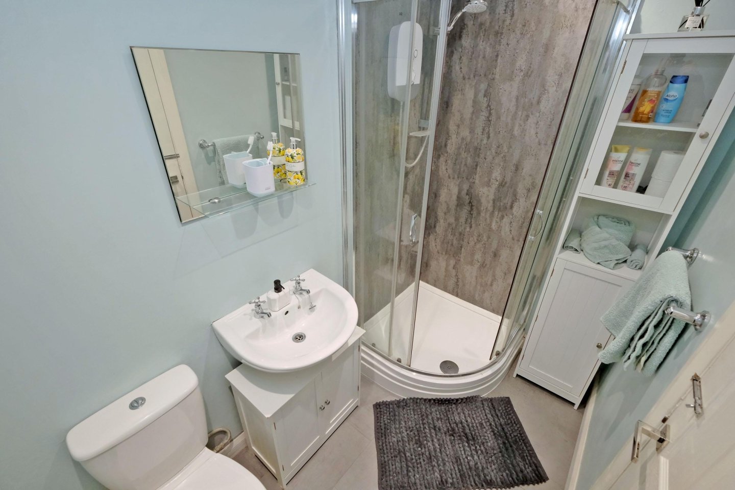 Shower Room: White two-piece suite with WC and wash hand basin. Corner shower with wall mounted Mira Meta shower and sliding glass doors. Aqua panelling to ceiling height at shower. Vinyl tiled flooring. Single radiator. Recessed spotlights. Xpelair. Usual fitments to remain.