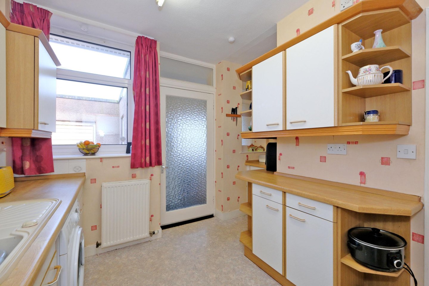 Kitchen: 3.40m x 3.35m (11’2” x 11’) approx. Ample wall and base units with contrasting worktops and splash back tiling. Ceramic sink and drainer with mixer tap. Potterton boiler housed in a low-level unit. Window with curtains to the rear. Vinyl flooring. Double radiator. Strip light. Glass panelled door leads into the Rear Porch. Free standing Bosh cooker with oven/grill and four ring hob and Hotpoint washing machine to remain.