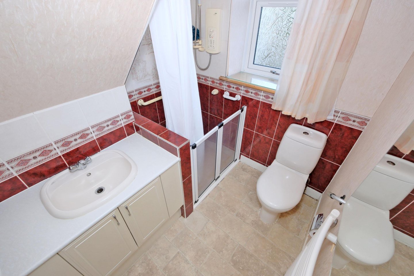 Shower Room: White two-piece suite with WC and wash hand basin set in a vanity unit. Walk-in shower with safety gate and wall mounted Mira Advance shower. Tiled to ceiling height at shower area and dado height at WC and wash hand basin. Frosted glass window with curtains. Vinyl tile effect flooring. White heated towel rail. Central light fitment. Usual fitments to remain.