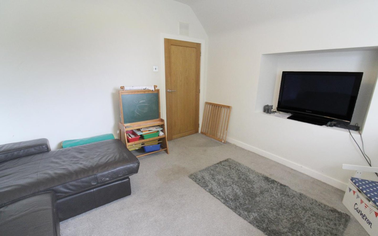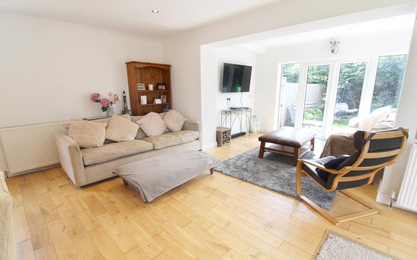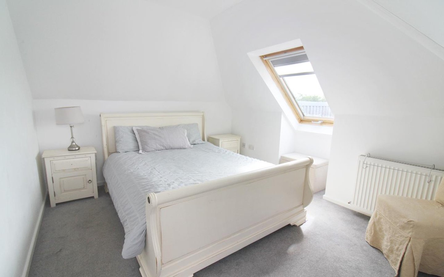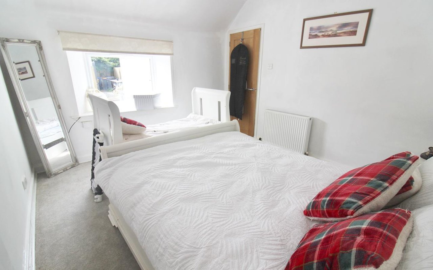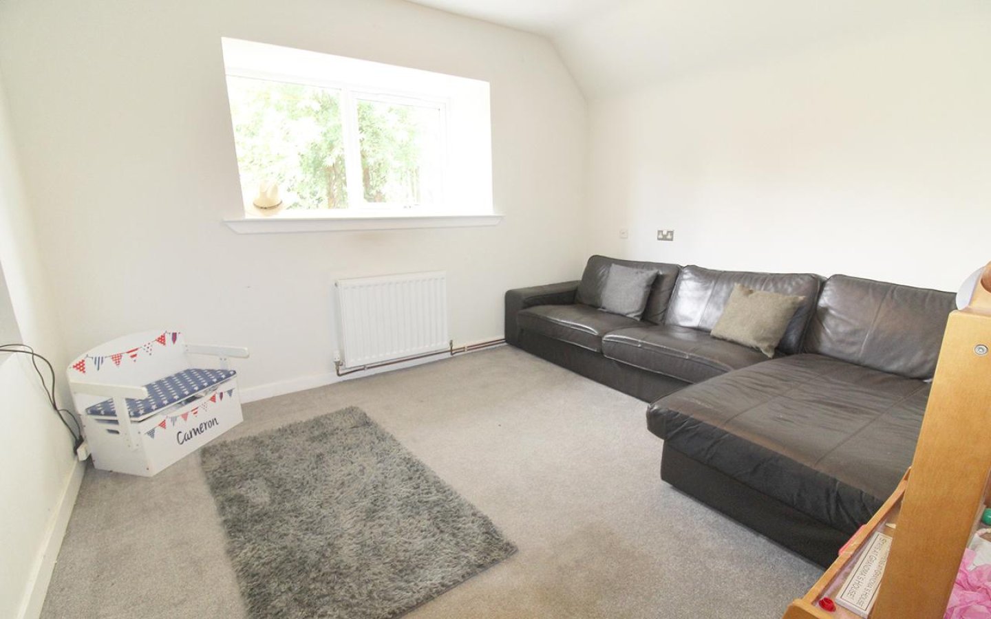 The ground-floor double bedroom is decorated in neutral tones and features a fitted carpet and a window with a deep display sill overlooking the front garden. Bedroom 4 is currently used as a sitting room and features a window with a deep display sill overlooking the rear garden. An alcove provides an ideal spot for a TV, and the room is finished with a fitted carpet.