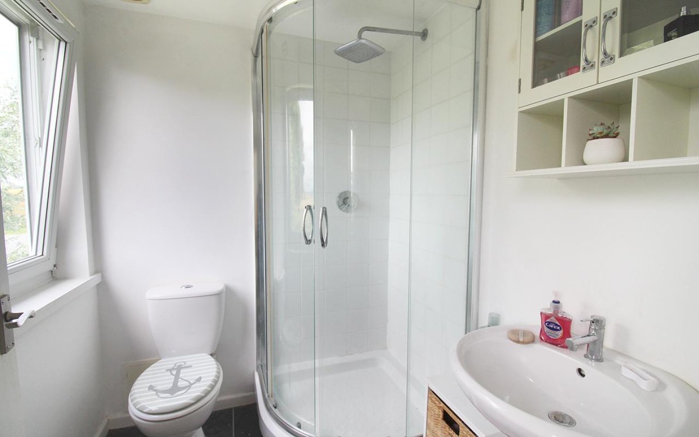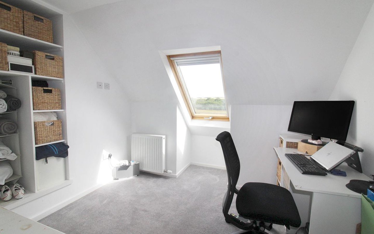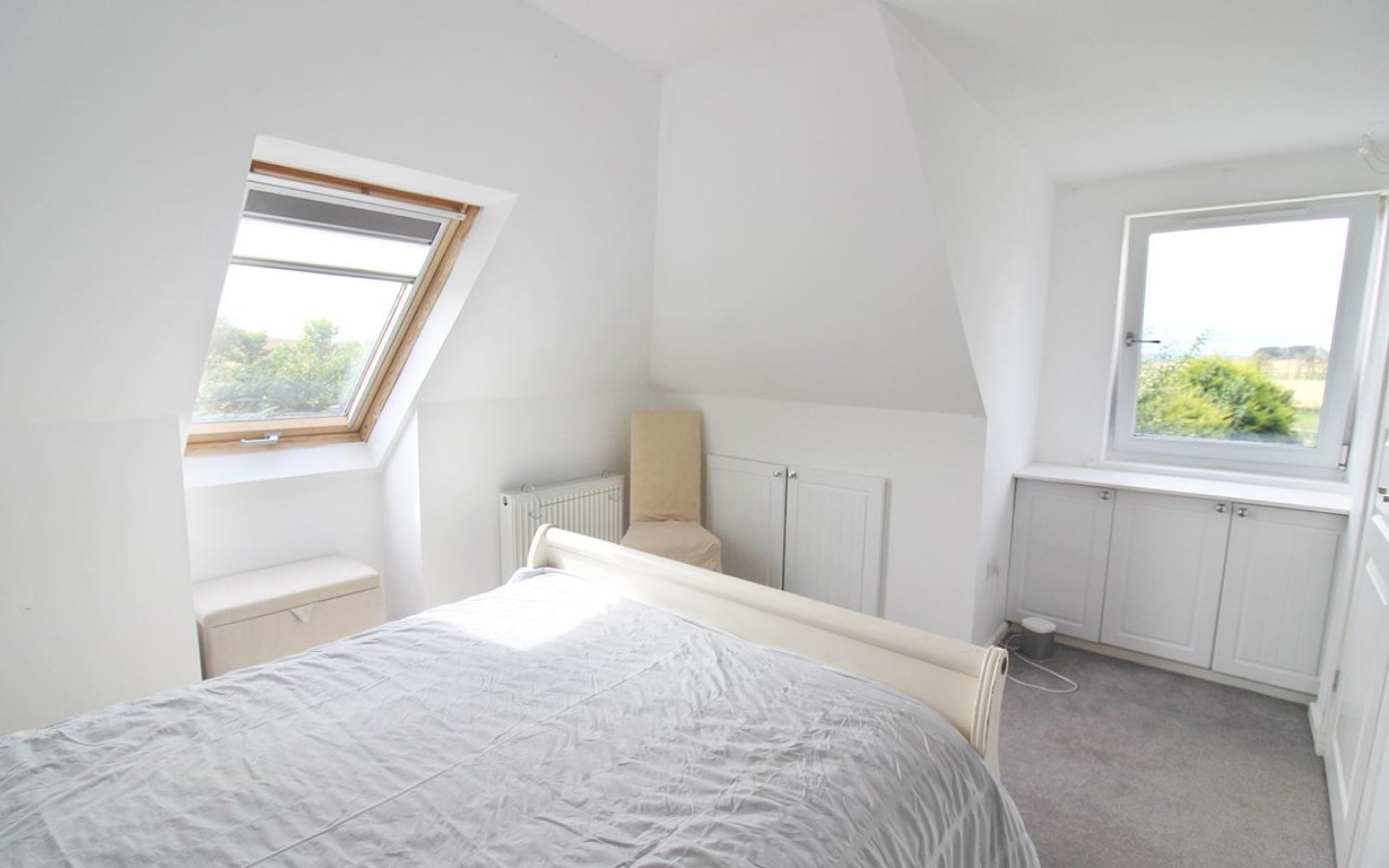 Bedroom 2 is a dual-aspect room with a window to the rear and a Velux window to the side. It includes built-in shelved cupboards. Bedroom 3 has a Velux window to the front and an open wardrobe with a hanging rail and shelving. Both bedrooms are fitted with carpets. The shower room has a rear-facing window and is fitted with a WC, hand basin, and a shower cubicle with a mains shower. The room is finished with the standard accessories and vinyl flooring.