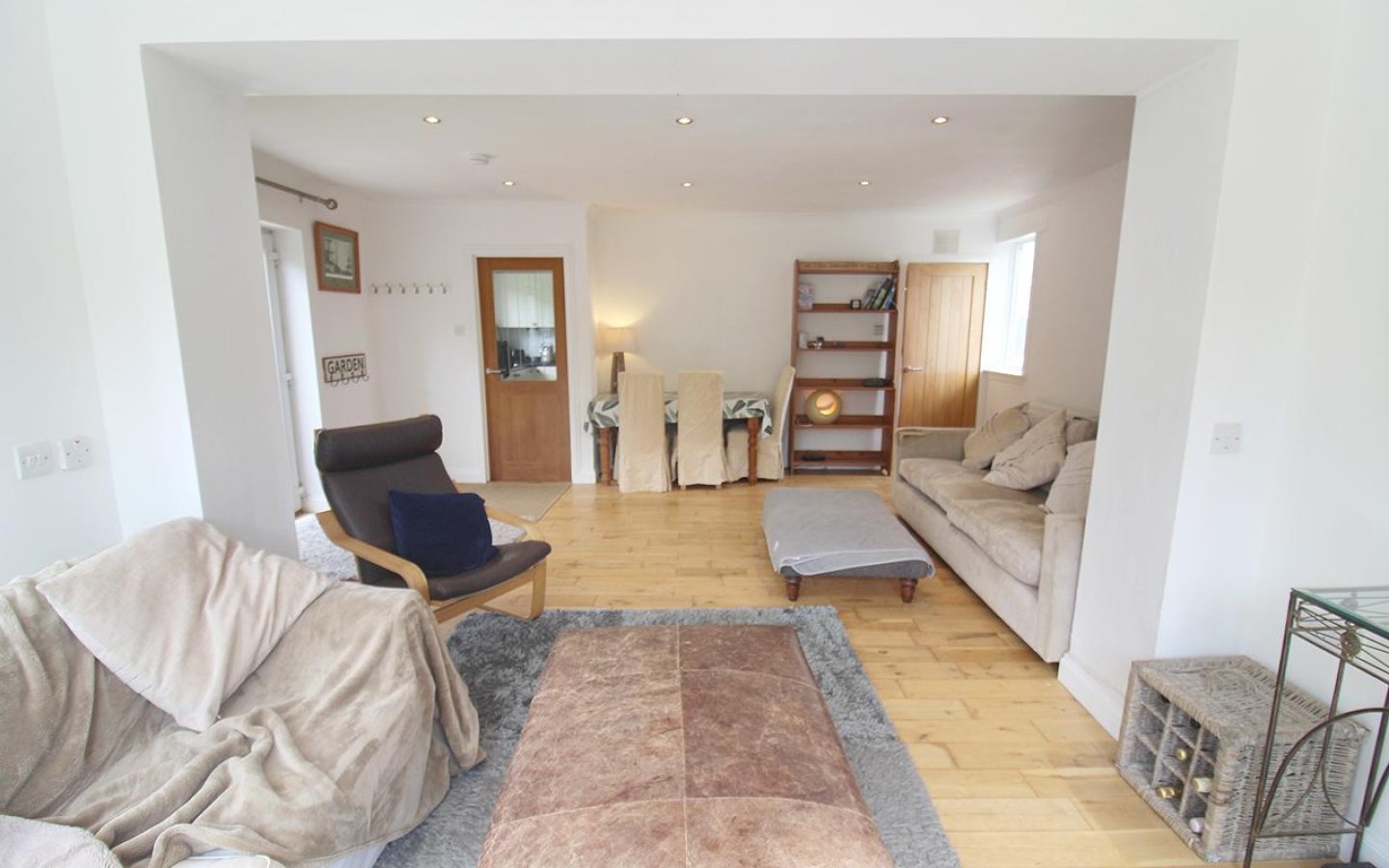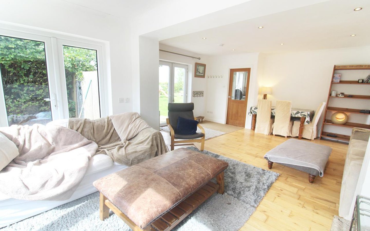 Currently, the property is accessed from the rear, however access from the road could be easily reinstated. A shared track from the B9001 leads to the main gate at Mosside, providing secure access to the property, large parking area and fenced paddock. A second gate provides access to the house via a securely fenced garden where the countryside views can also be appreciated. The property is accessed via French doors into the open-plan lounge and sunroom. This large, multifunctional space provides ample room for a dining set, and two further sets of French doors open into the south facing part of the garden. The room is finished with spotlights and a wooden floor. The lounge provides access to both the kitchen and the hall.