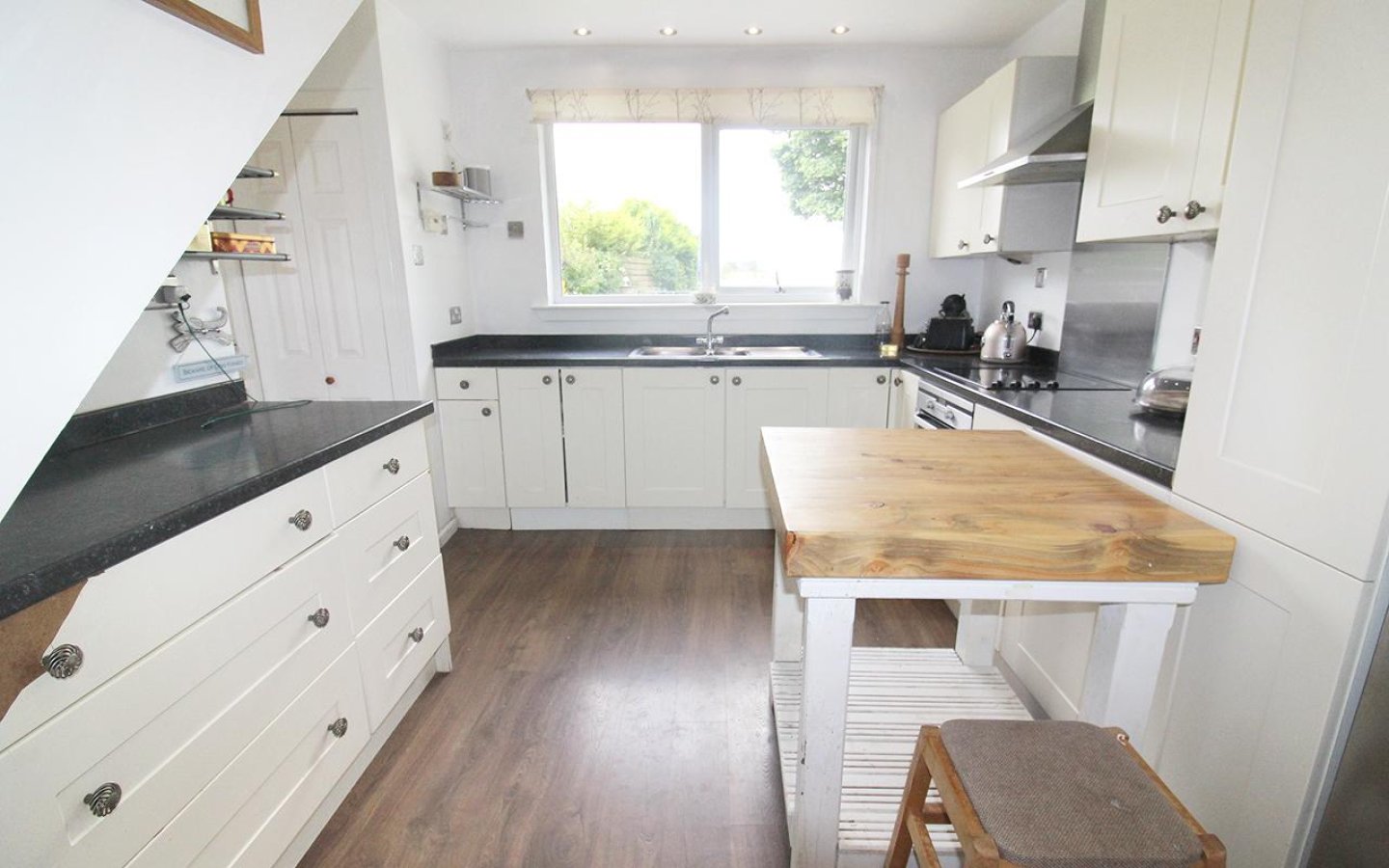 The kitchen is fitted with a range of base and wall-mounted units with contrasting worktop and upstands. Integrated appliances include an electric oven and hob with cooker hood and extractor above. A 1 ½ stainless steel sink with mixer tap is positioned under a double window overlooking the garden. The floor is finished in laminate. The kitchen also houses the boiler (within a cupboard) and has a large open pantry that functions as a utility area, with plumbing for a washing machine. The pantry includes shelving and a tiled floor.